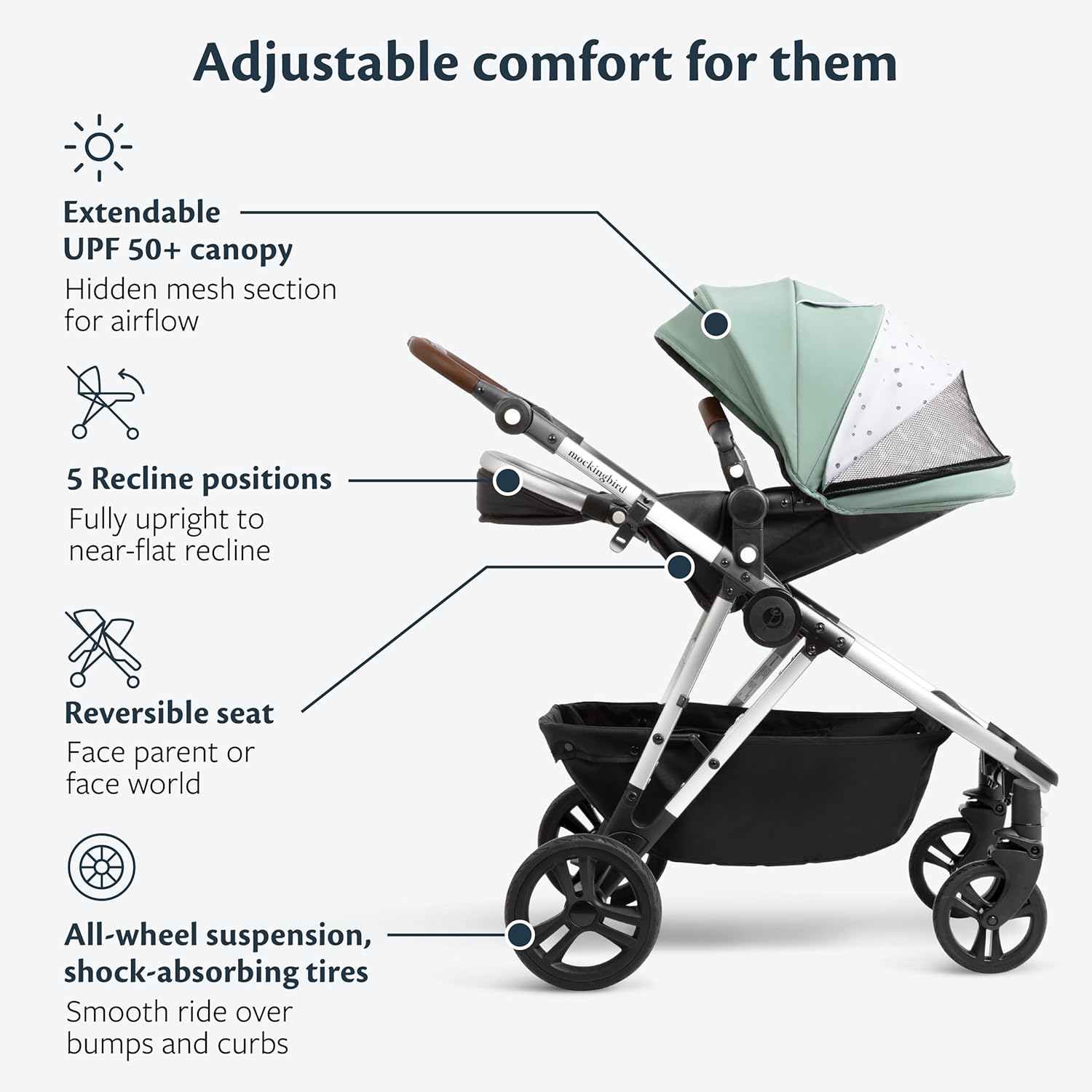 - ADD-ON NEWBORN ACCESSORIES: Stroll from birth with any of our three Infant-compatible Accessories (sold separately): a cozy lie-flat Bassinet, a space-saving Infant Insert that goes directly onto the stroller seat, or a Car Seat Adapter that’s compatible with over 35+ leading infant car seat models.