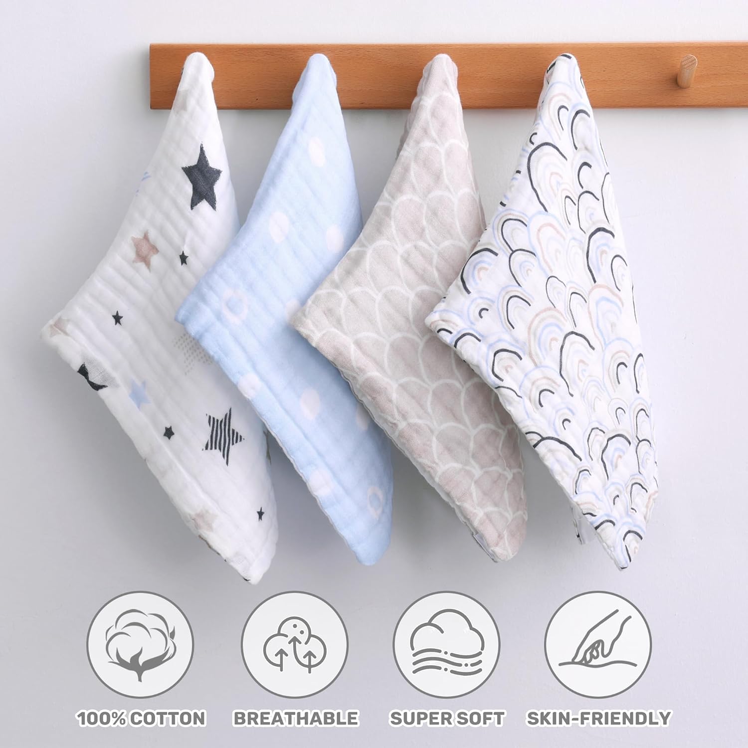 Viviland Baby Muslin Burp Cloths, Super Absorbent Washcloths for Baby Girl and Boy, 10 x 20 inches 6-Layer Baby Bath Towels, Blue Rainbow & Stars 4 Pack