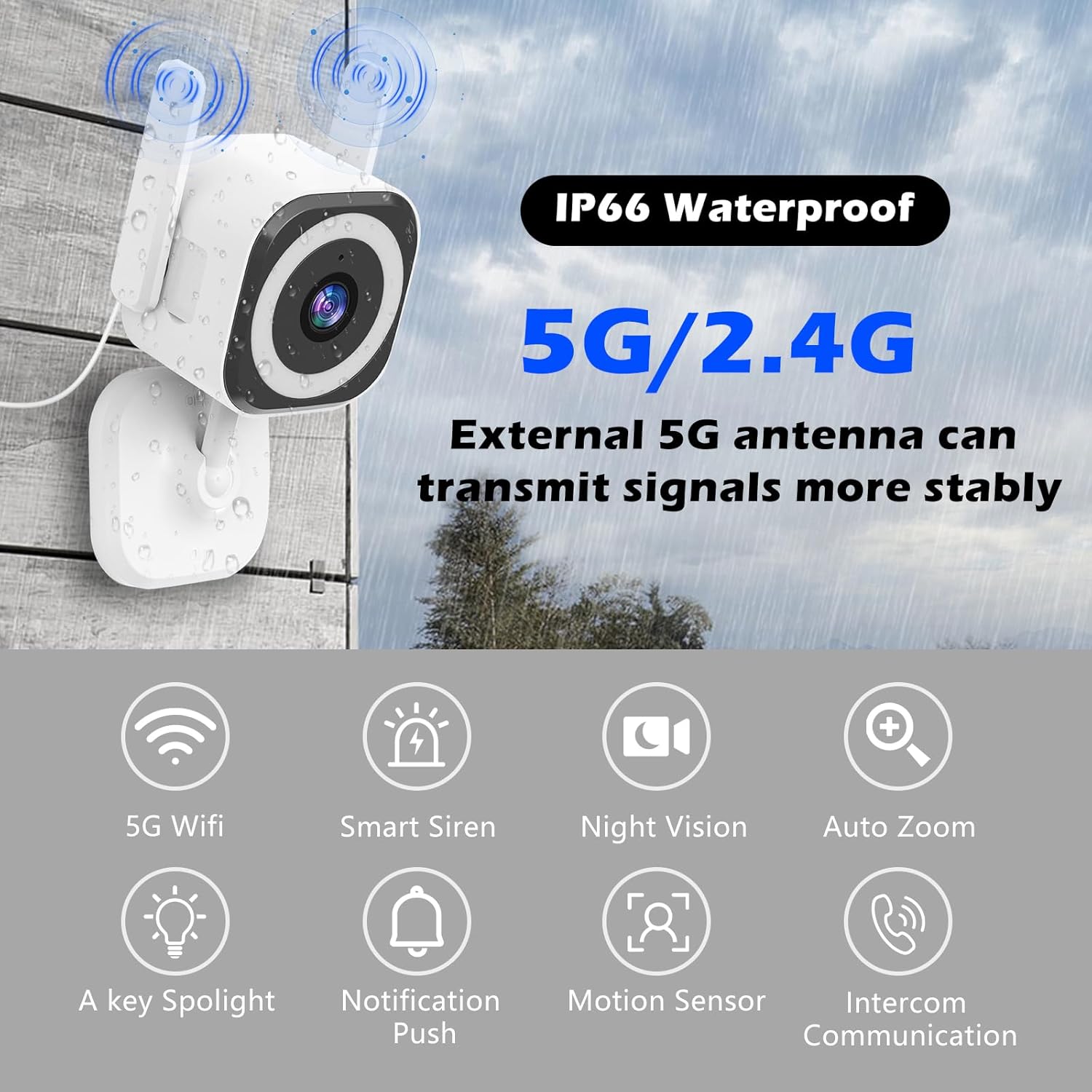 - 【5G External Antennas Provide Stronger Signals】The outside camera for home camera is equipped with 5G external antennas provides stronger and more stable connection. Install the camera for room in places such as the garden, front porch,garage, kitchen, living room, baby room, etc. to ensure home security.