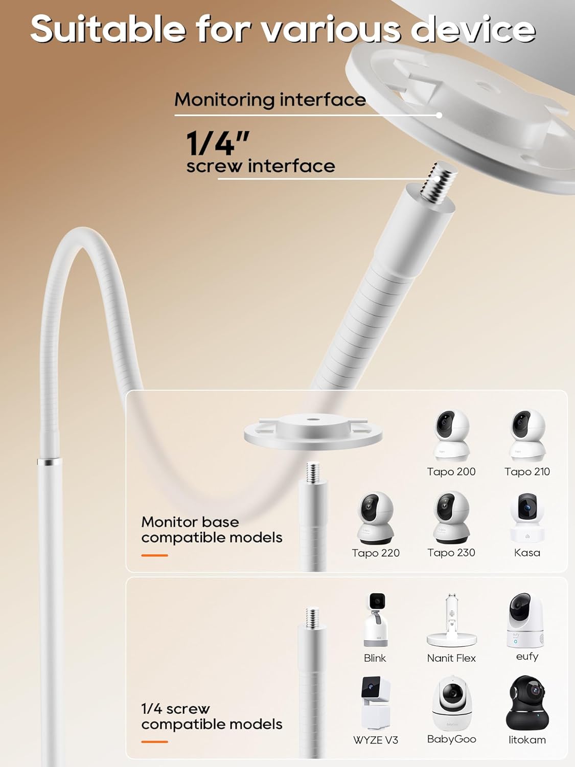 - 【Universal Compatibility】: SAPESEHE floor stand baby monitor holder is designed to work seamlessly with the Nanit Pro Smart Baby Monitor & Flex Stand/Tapo C200/Tapo C210/HelloBaby HB65TX HB66 pro/Kasa EC70/WYZE Pan v3/eufyE220/Blink Mini Pan-Tilt Camera, and any monitor or baby monitor cameras with a 1/4-inch threaded hole (tripod mount). Please confirm your camera model before purchase. (NOTE:All Baby monitors are not included) If you're unsure, feel free to inquire about compatibility with your device.