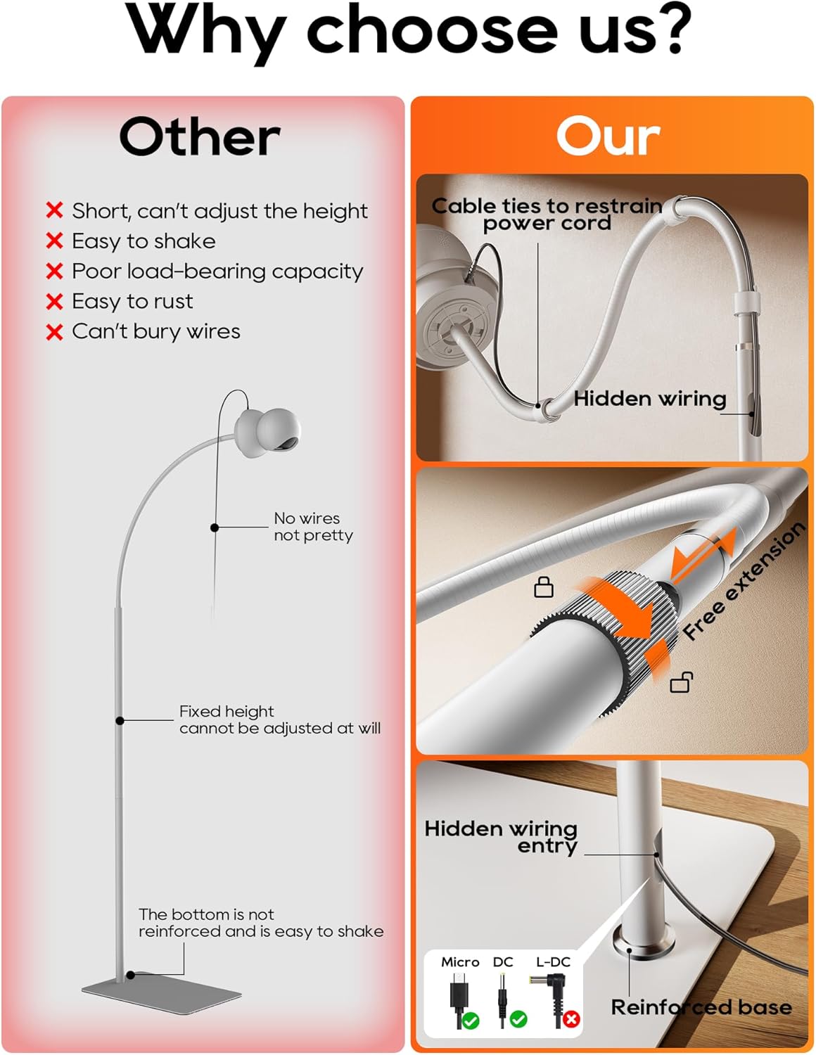 - 【PREMIUM MATERIALS & EXCEPTIONAL STABILITY】: Crafted entirely from metal, including the round tubes and the top flexible gooseneck tube, this baby monitor floor stand is made of high-quality, sturdy carbon steel for enhanced durability and stability ensures that the camera will not fall off. The enlarged, flat base with anti-slip pads not only provides a firm foundation but also protects your floors from scratches.