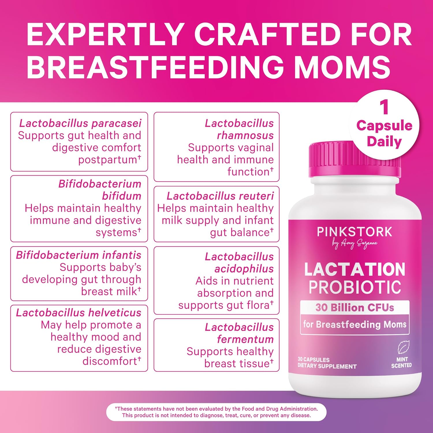 Pink Stork Lactation Probiotic - 30 Billion CFUs Multi Strain Postnatal Probiotics for Breastfeeding Women - Support Breast Milk & Gut Health, Postpartum Essentials, Mint Essence, 30 Capsules