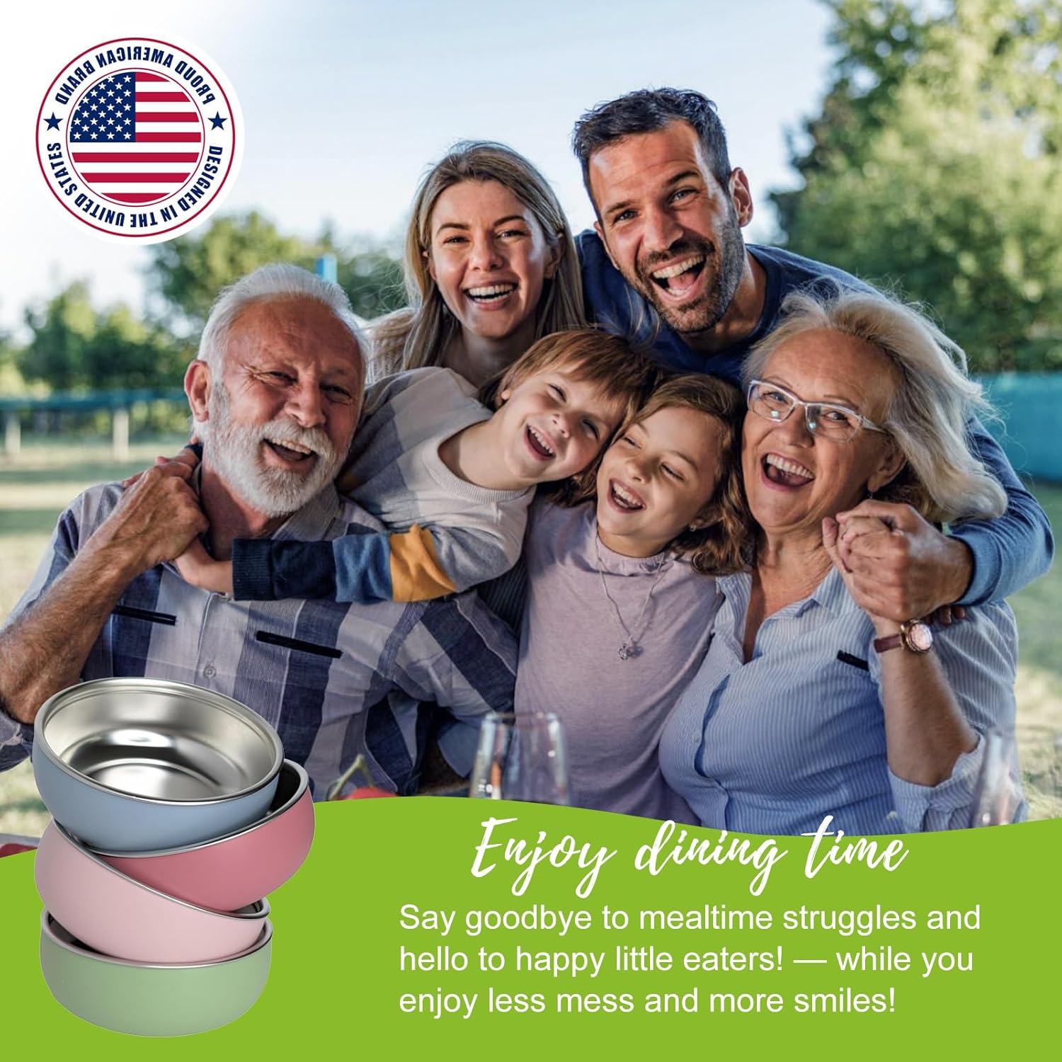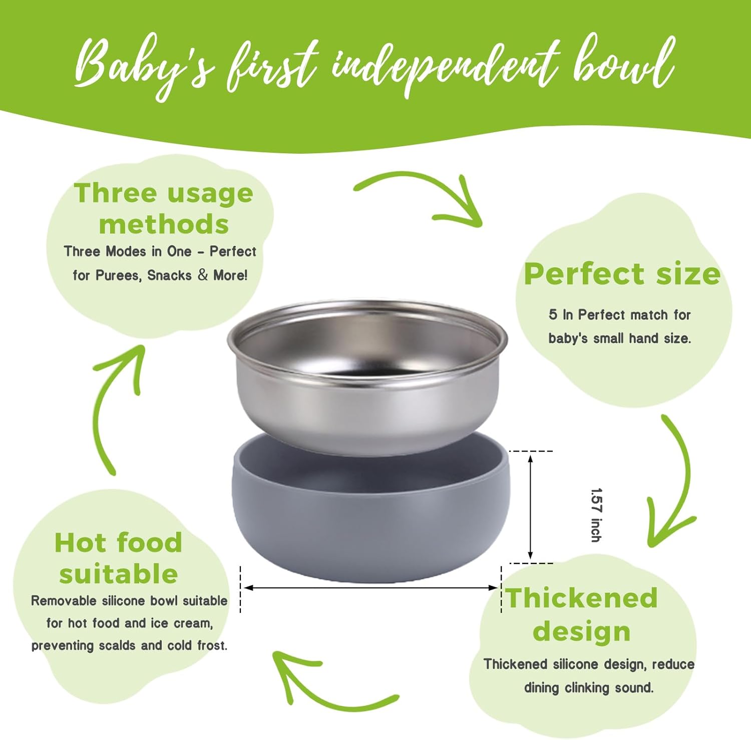- Farewell to Chaotic Dining Enjoy mealtime and reduce dining chaos, Our Stainless steel bowls for kids Engineered with weighted wide bases and curved edges to prevent 73% more spills. than regular toddler bowls. The grippy silicone shell stays put on high chairs while making scooping effortless – perfect for wobbly little hands mastering self-feeding!
