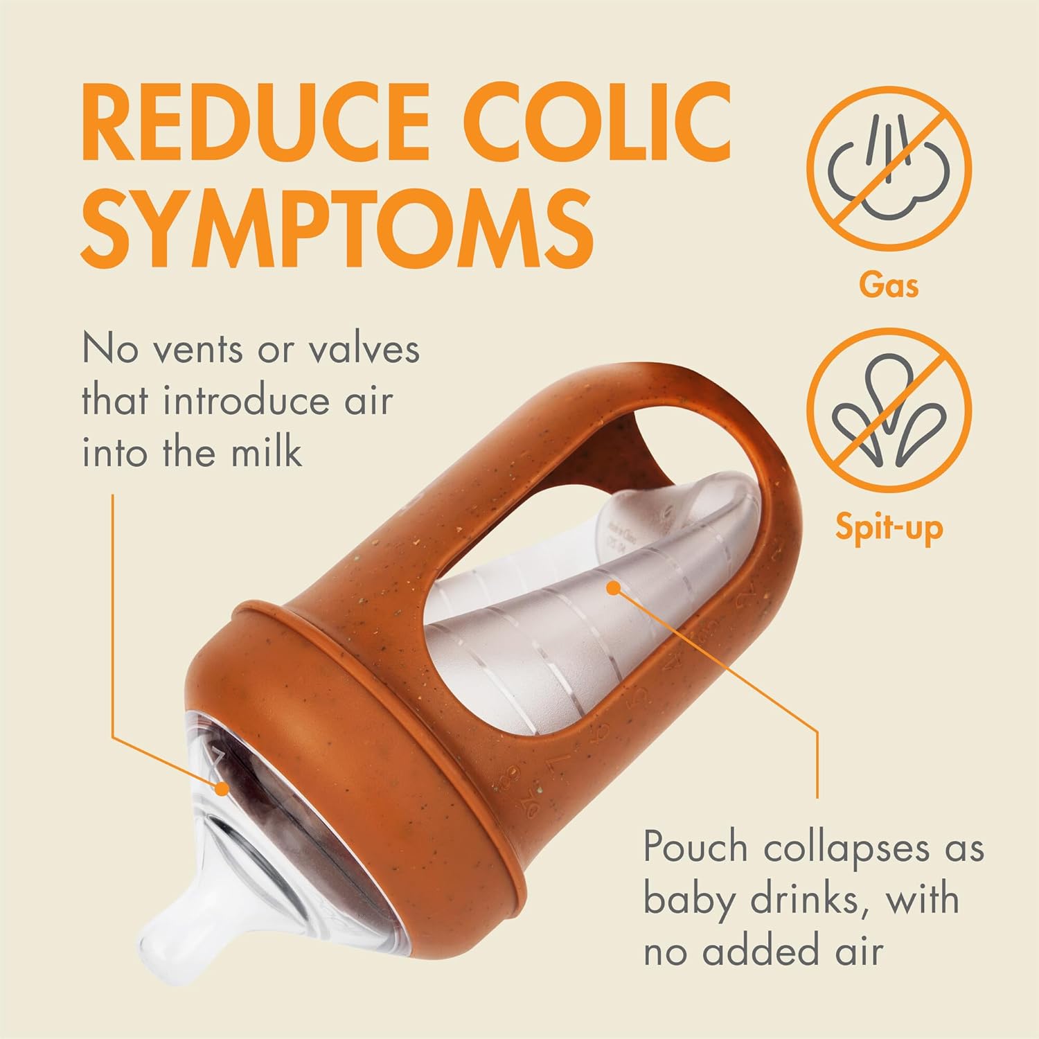 - Reduce Colic Symptoms: Say bye-bye to gas and spit up! The air-free feeding design of our silicone baby bottles features a pouch that collapses as baby drinks—no vents or valves needed