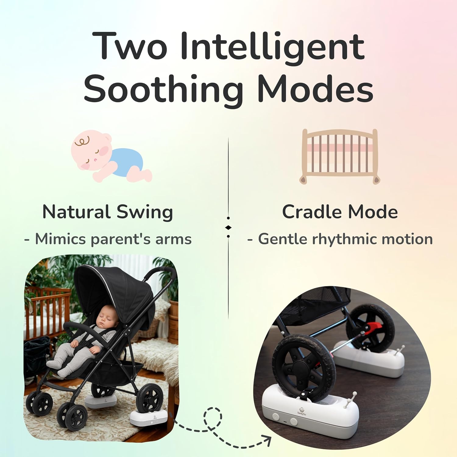- Two Intelligent Soothing Modes: - Natural Swing Mode: Mimics gentle swaying of a parent's arms with non-regular movements for a natural feel. - Cradle Mode: Simulates the rhythmic swinging of a traditional cradle for a familiar sense of security.