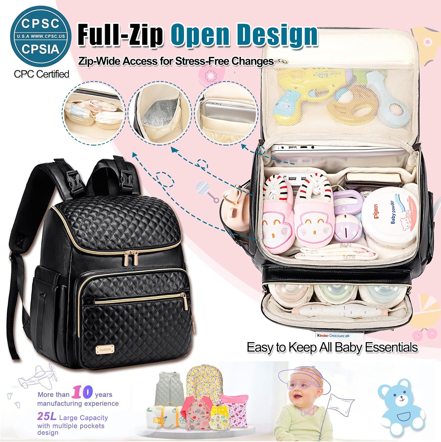 - 【Multi-Functional for On-the-Go Parents】Travel diaper backpack designed for convenience, baby backpack has stroller straps for hands-free carrying and a luggage sleeve for travel. The wide-mouth opening + dual zippers baby bag for mom make packing effortless, while the included changing pad (24"x15.7") ensures clean diaper changes anywhere. Made with water-resistant faux leather (PU) and waterproof lining, it’s both durable and easy to clean.