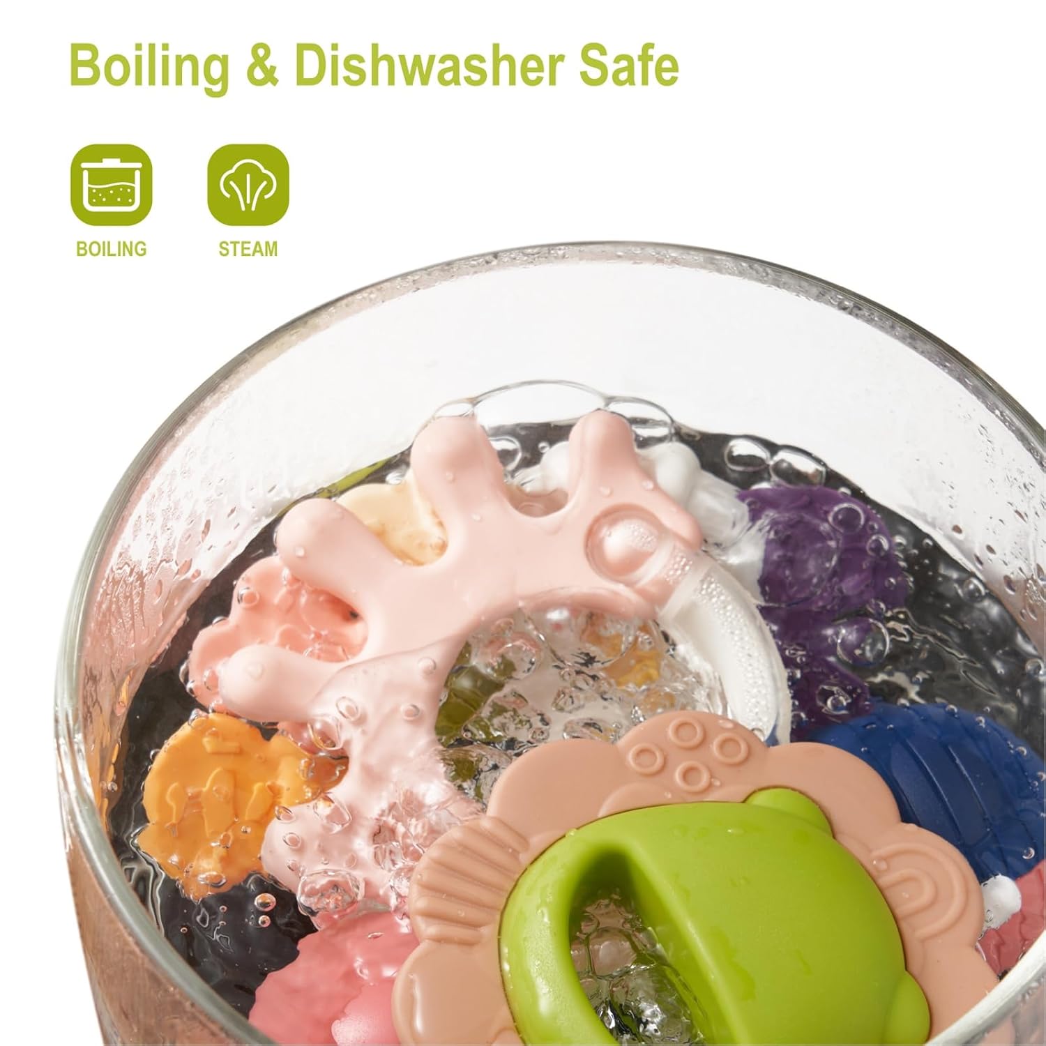 - Teething Function:The chewing and teething baby toys are made of BPA-free plastic. Polished smooth edges, Burr-free and strong enough to withstand chewing and large enough to avoid choking hazards. Our baby teether toys are safe for the baby to touch, chew and gnaw.
