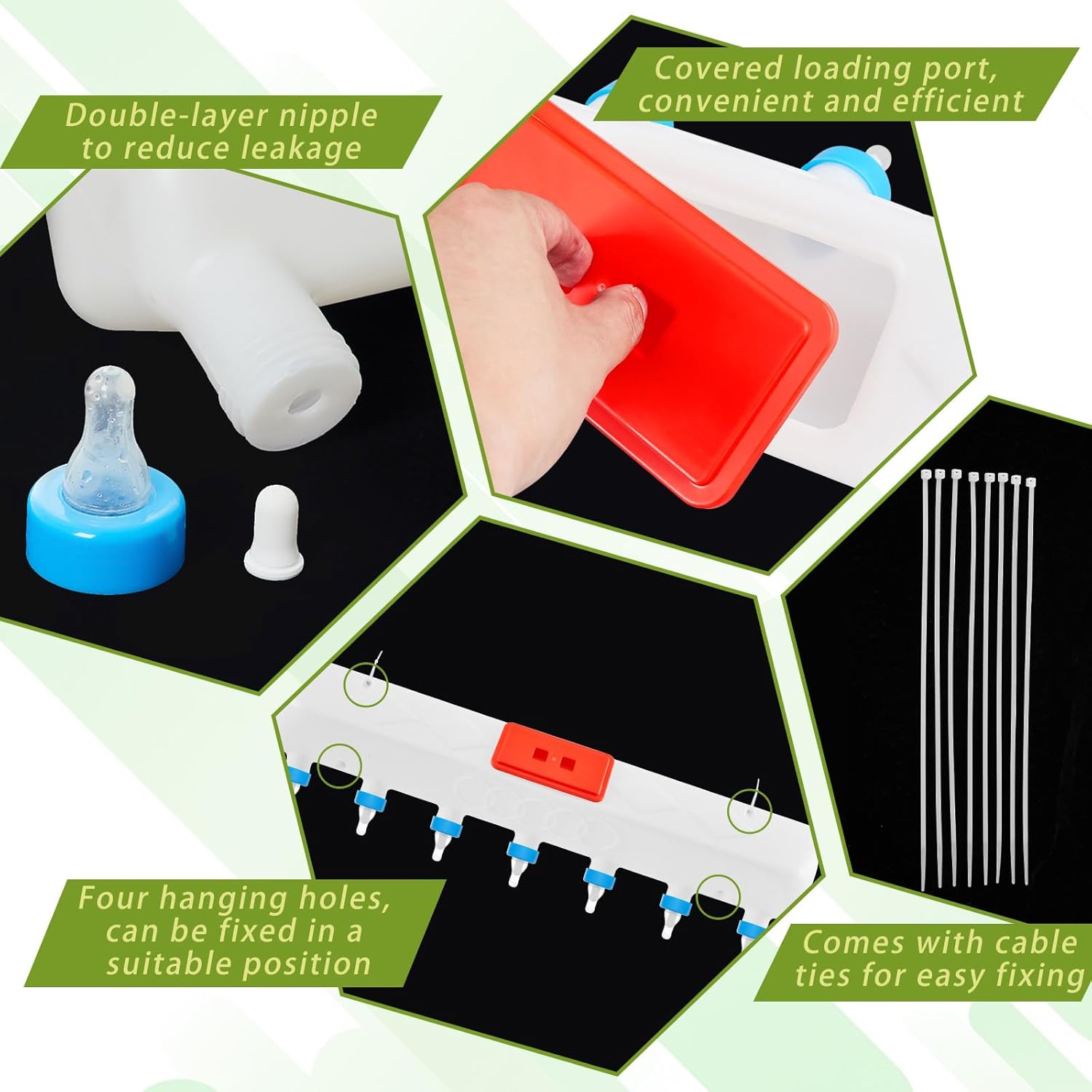 - 7 Pacifier Small Animal Milk Feeder Set: you will receive a small animal feeder with 7 pacifiers and 10 cable ties; The feeder is equipped with hanging holes in advance for you to install the product inside and outside the cage or on the fence; This feeding device is a tool for the farm to help farmers achieve efficient feeding and improve the efficiency of farming