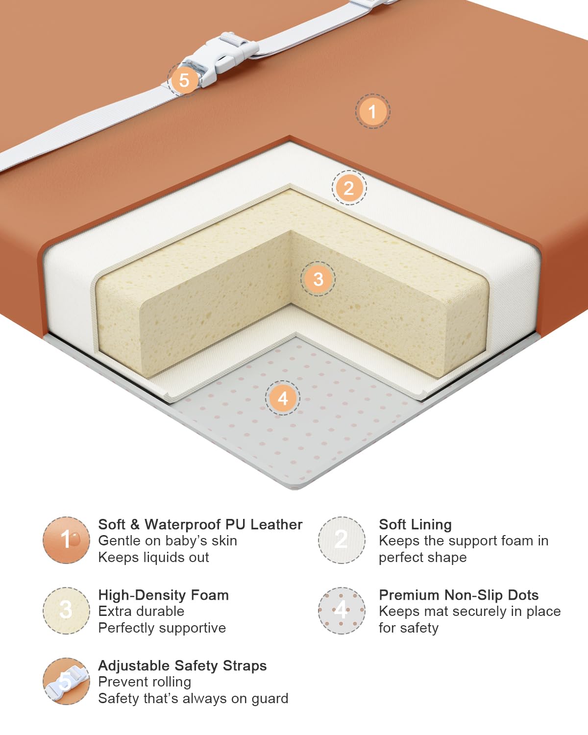 - Wipe-Clean Easy : Waterproof Changing Pad is made of high-quality PU leather offers a soft, smooth touch, gentle on baby's sensitive skin. Outstanding waterproof, stain-resistant, and effortless cleaning! Whether it's leaks, diaper residue, or oils, simply wipe clean with a damp cloth or baby wipe – no scrubbing required. Maintains hygiene effortlessly, saving you precious time and energy