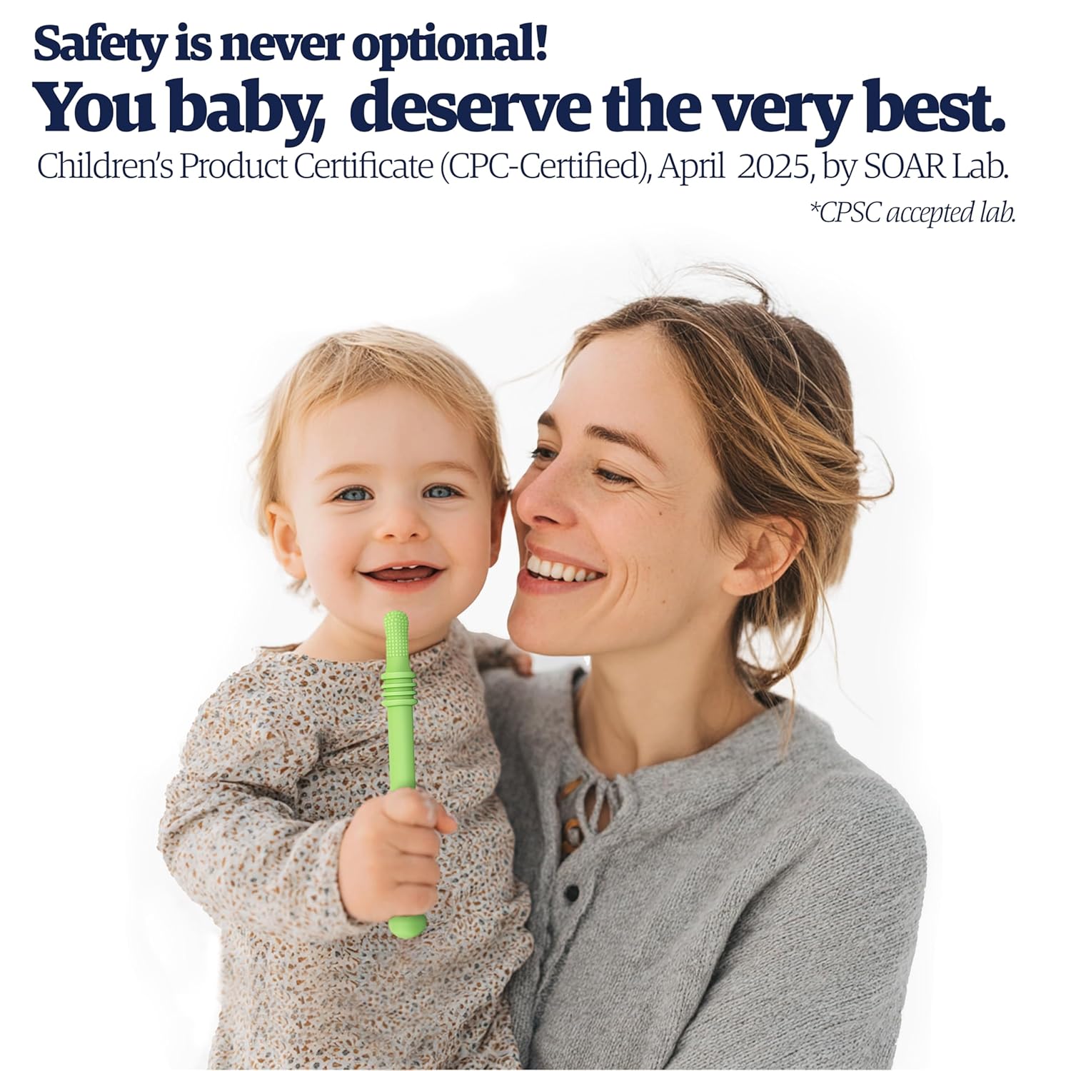 - CPC Certified, ASTM & CPSIA Approved: Your baby’s safety is our top priority. Zuzu's premium teether is made from food-grade silicone and undergoes rigorous quality checks to meet and exceed industry-leading safety standards including ASTM F963-23 and CPSIA regulations. Each teether is independently tested and approved by a CPSC-certified laboratory, ensuring it’s free from harmful substances and safe for daily use. Backed by a Children’s Product Certificate (CPC), Zuzu delivers unmatched peace of mind for parents and gentle, worry-free comfort for babies.