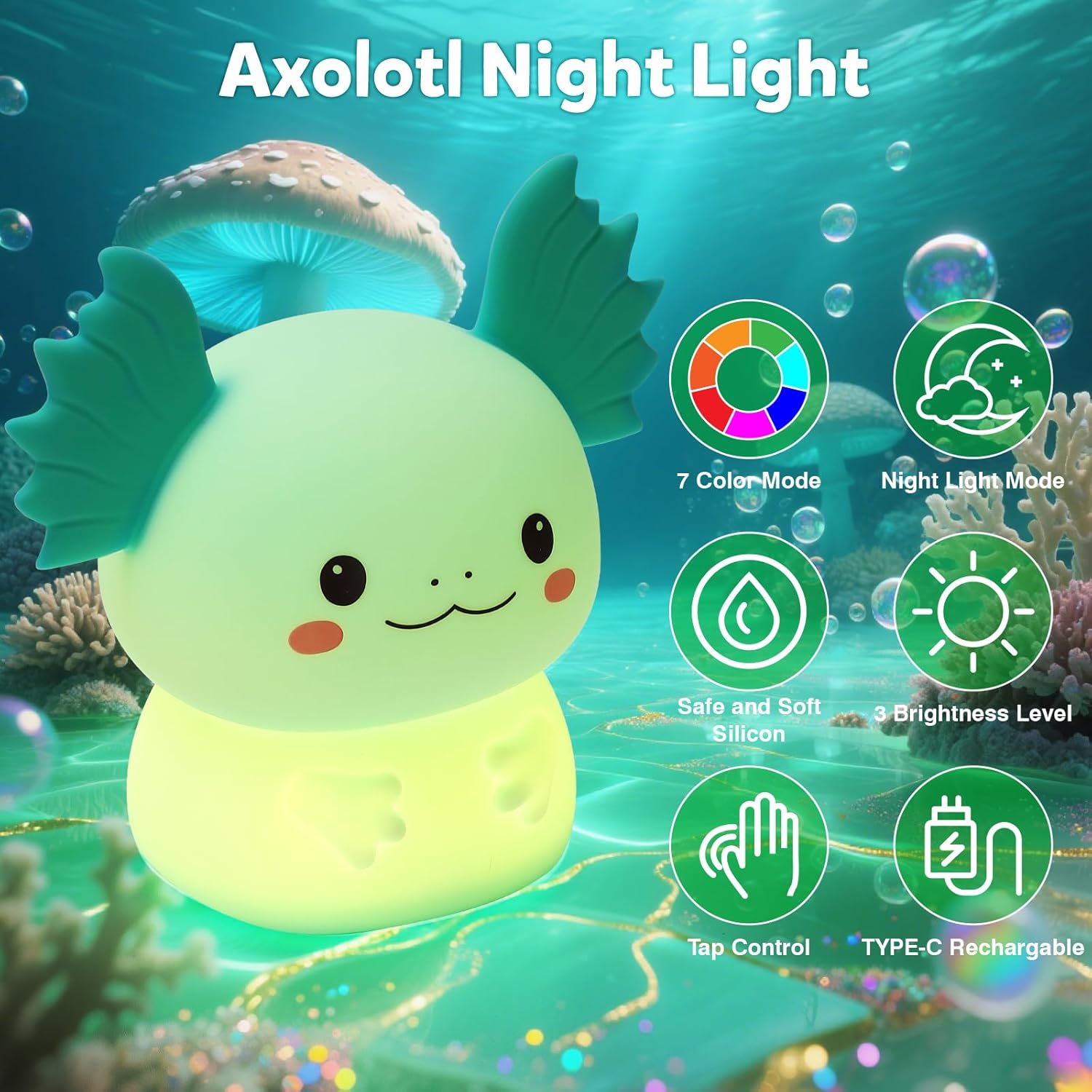 - 【Premium Safe Silicone】Crafted from soft, food-grade BPA-free silicone, this adorable Axolotl night light is safe for kids.Soft light without flicker, gentle protection of baby's delicate eyesight, accompanied by sleep more at ease.