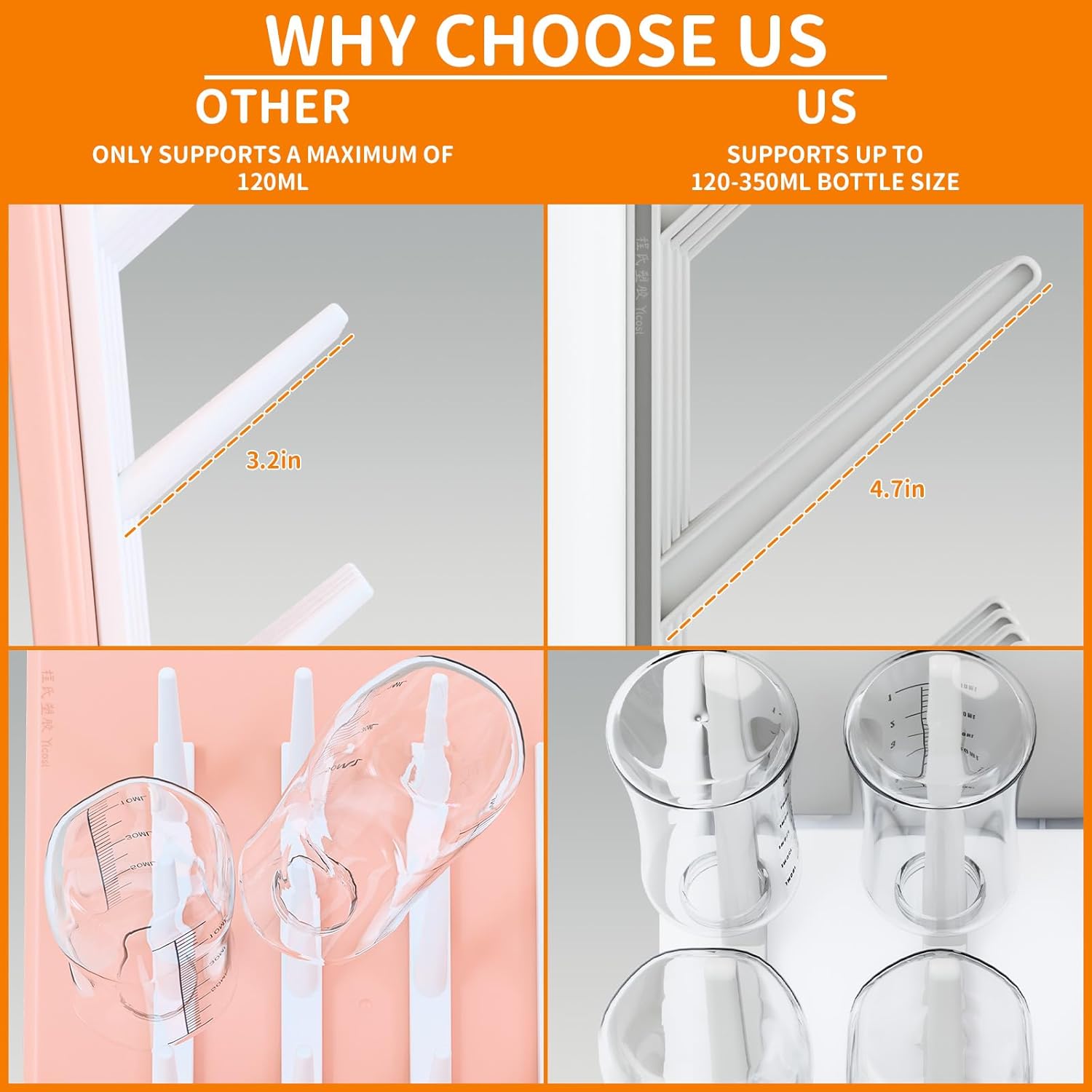 - 【Large-Capacity/Quick Drying Design】 Holds up to(4x3) 12 Pcs narrow/Standard/Wide Neck,4-12oz bottle,The front provides 1 large baby accessories Organizer for pacifiers,pump parts,feeding accessories storage area,The quick-drying vertical design allows the water to drain into the removable bottom, keeping your counter dry and tidy(Includes 4 brackets and 1 extra one for future use)