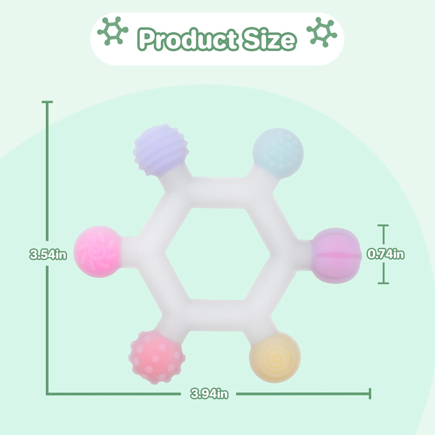 - 1.Unique Hexagonal Massage Design & Diverse Textures: The hexagonal body features six outward-projecting soft nubs. Each nub is meticulously designed with a distinct textured surface (e.g., waves, dots, stripes). This varied tactile design comprehensively stimulates different areas of baby's gums, providing more effective soothing massage.