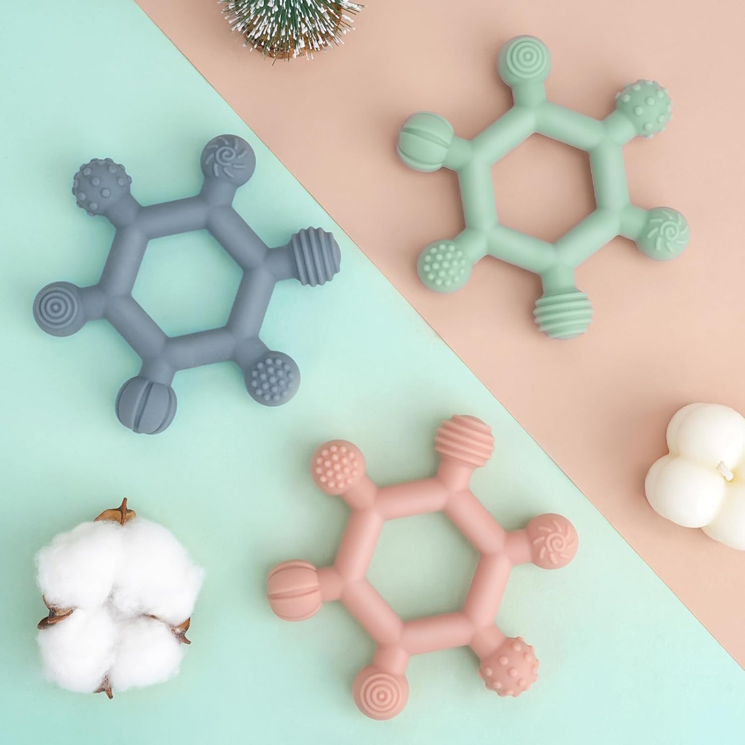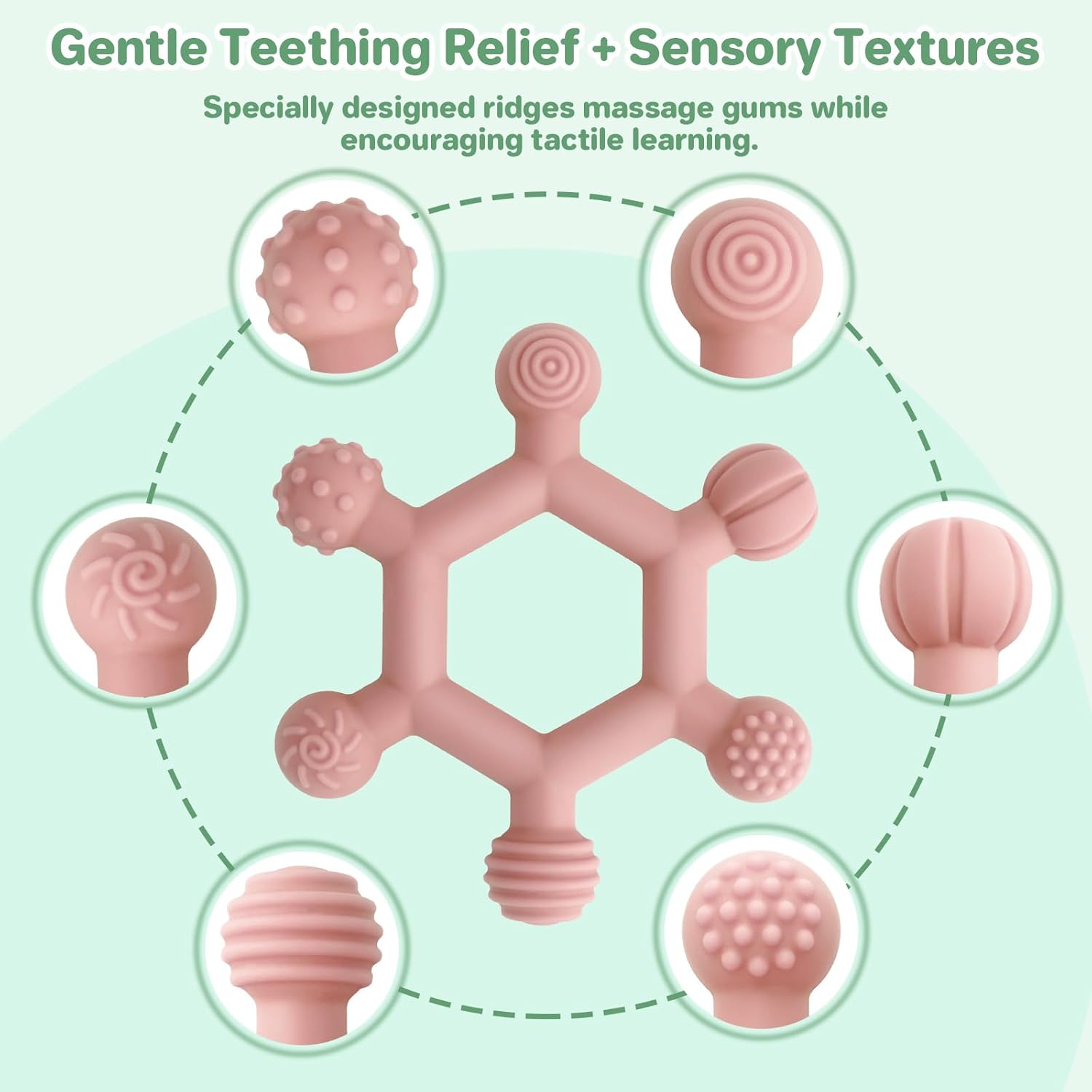 - 1.Unique Hexagonal Massage Design & Diverse Textures: The hexagonal body features six outward-projecting soft nubs. Each nub is meticulously designed with a distinct textured surface (e.g., waves, dots, stripes). This varied tactile design comprehensively stimulates different areas of baby's gums, providing more effective soothing massage.
