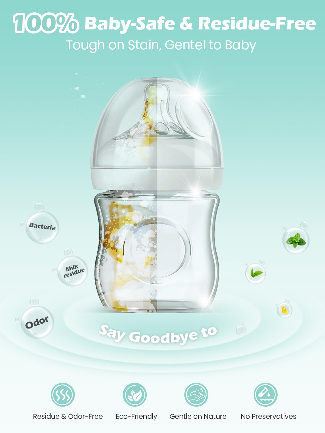 - Superior Cleaning Performance- Harness the power of our advanced natural enzyme formula, which is 2.6 times richer in cleaning agents than other brands. It penetrates deep to break down stubborn milk residue, stains, and odors, leaving baby bottles and feeding accessories immaculately clean every use.
