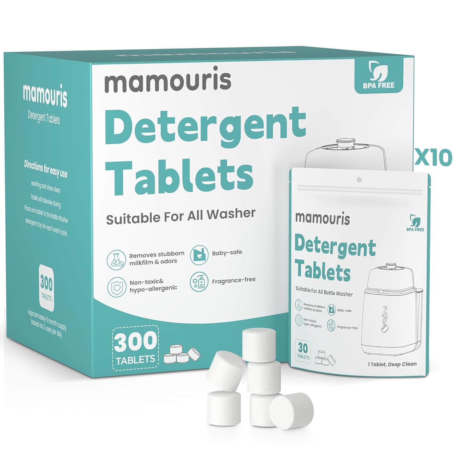- Compatible with All Bottle Washers Brands- Intended for Baby Brezza, Momcozy, GROWNSY, Papablic bottle washers, and all other brands. Mamouris detergent tablets gently and efficiently remove milk film from baby bottles and pump parts, making them an essential must-have for a newborn's registry.