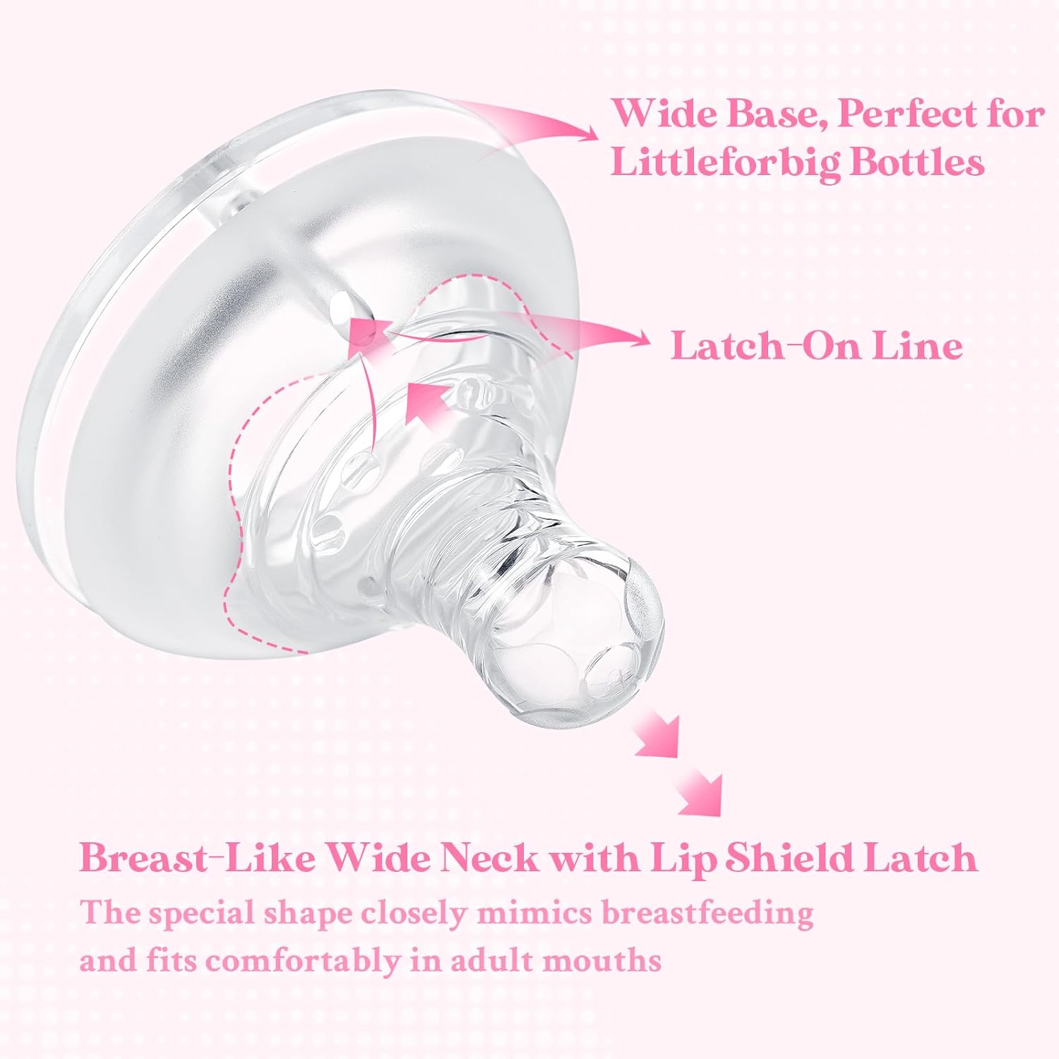 - Comfortable, Natural Fit: These bottle nipples feature a natural shape and soft texture that fit comfortably in the mouth, closely mimicking the feel of breastfeeding. Measuring 1.73" long by 1.97" wide, they are fully compatible with standard 1.97 inches wide-mouth bottles—perfectly fitting Littleforbig Adult Bottles and similar designs. Please note: bottles sold separately.