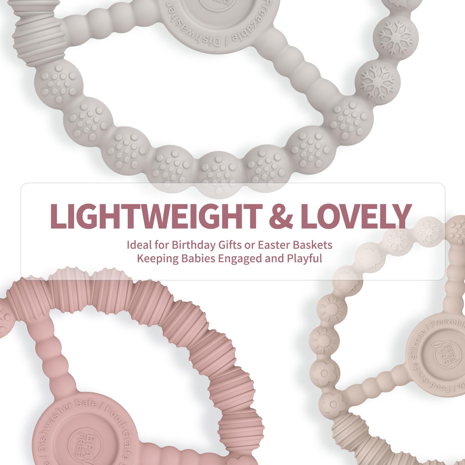 Teething Rings for Babies 0-6 Months, 3 Pack Silicone Teether Toys 6-12 Months, Freezable & Durable Chew Ring for 3-6 Months Boys Girls Teething Relief, Infant Essential Gifts (Sandy Rose Pink)