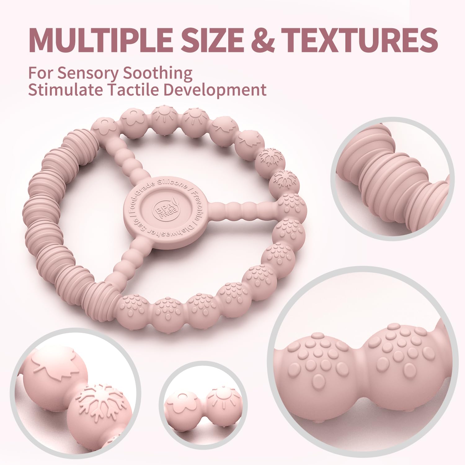 - Multi-Texture & Tactile Development: Multi-texture baby teething toys features varied bead sizes and bumpy surfaces to stimulate tactile development. Lightweight silicone rings are freezable for extra teething relief from sore gums for babies.