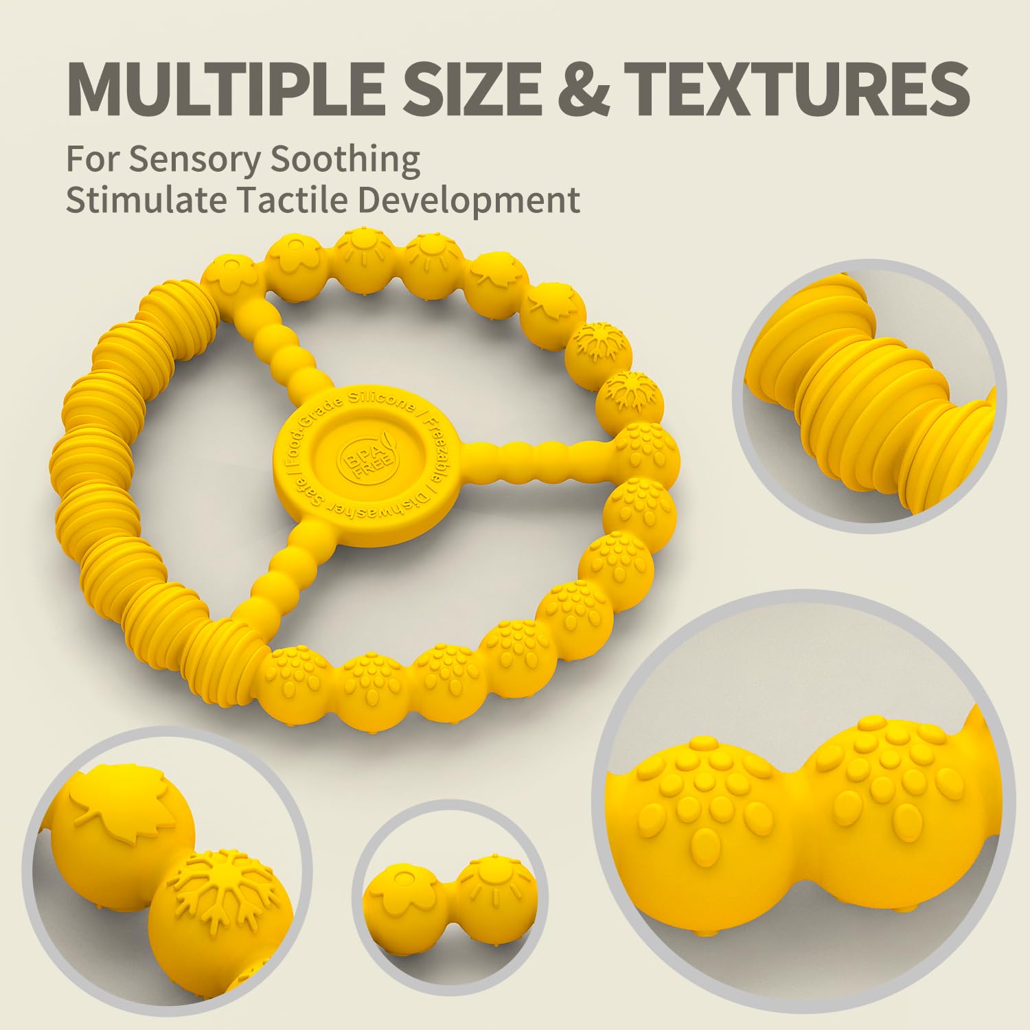- Multi-Texture & Tactile Development: Multi-texture baby teething toys features varied bead sizes and bumpy surfaces to stimulate tactile development. Lightweight silicone rings are freezable for extra teething relief from sore gums for babies.