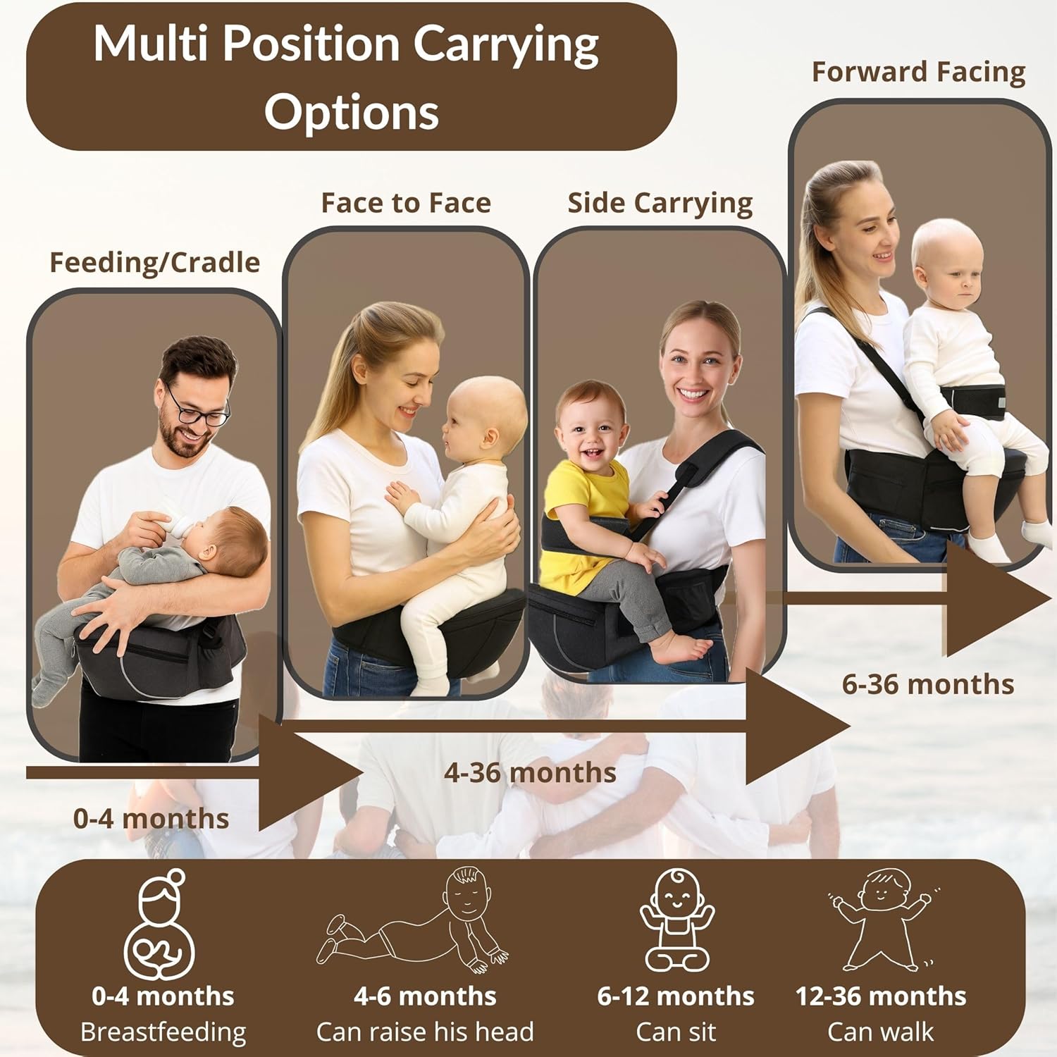 - π ADAPTS TO YOUR LIFESTYLE: With multiple carrying options, the KAENU Baby hip seat lets you carry your child face-in, face-out, on the side, or in nursing position, strengthening parent-baby bonding every day.