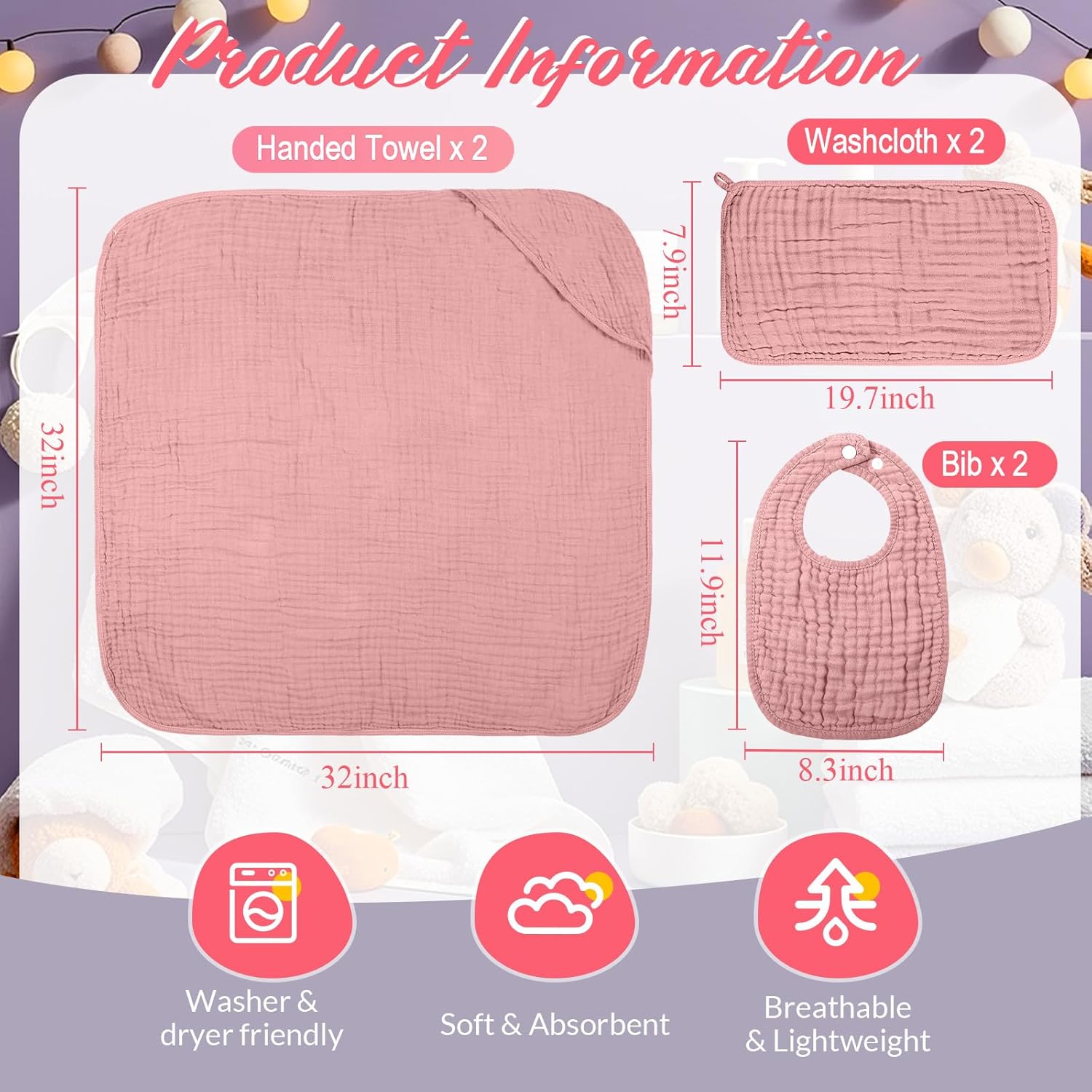 6 Pcs Muslin Hooded Bath Towels Washcloths and Bibs Set, Muslin Cotton Baby Towels Absorbent Hooded Blanket Towel Infant Bibs for Boys Girls Newborn Infant Essentials(Pink, Brown)