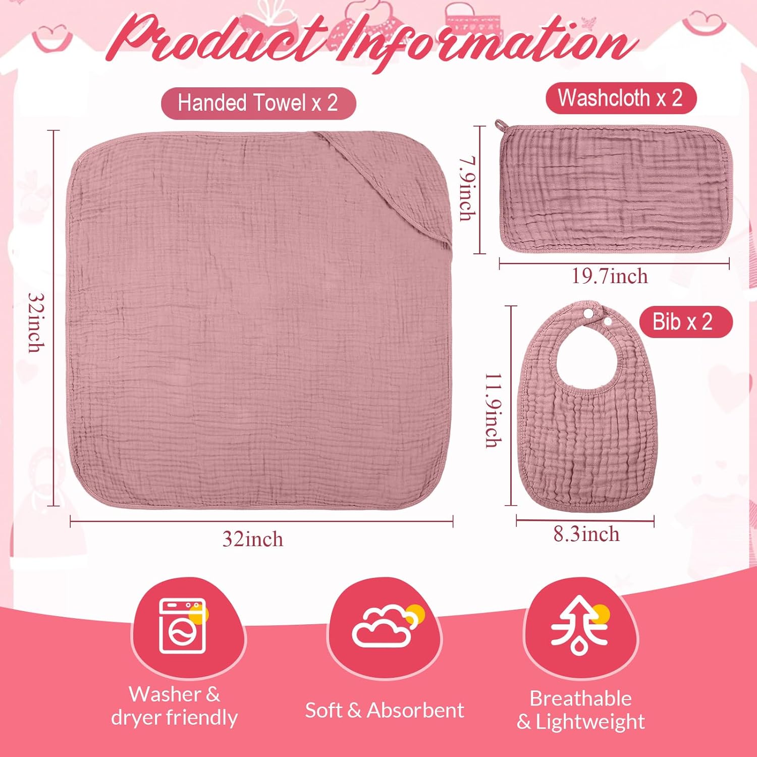 6 Pcs Muslin Hooded Bath Towels Washcloths and Bibs Set, Muslin Cotton Baby Towels Absorbent Hooded Blanket Towel Infant Bibs for Boys Girls Newborn Infant Essentials(Pink,Rose)