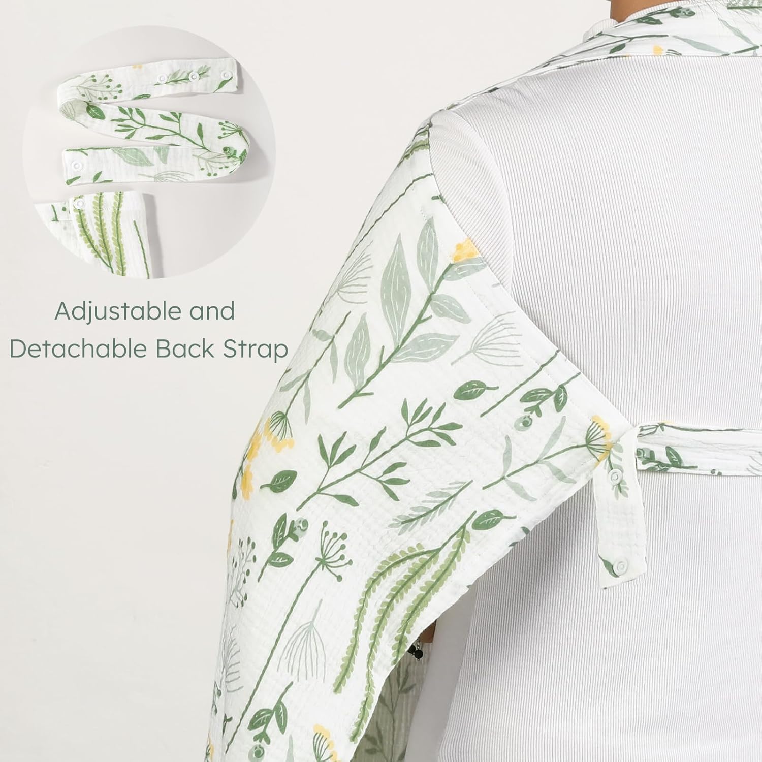 - Detachable and Adjustable Back Straps: Featuring detachable and adjustable back straps, this muslin nursing cover stays in place during breastfeeding sessions, even in windy conditions. The snaps on both sides allow for easy attachment and removal of the strap as needed.
