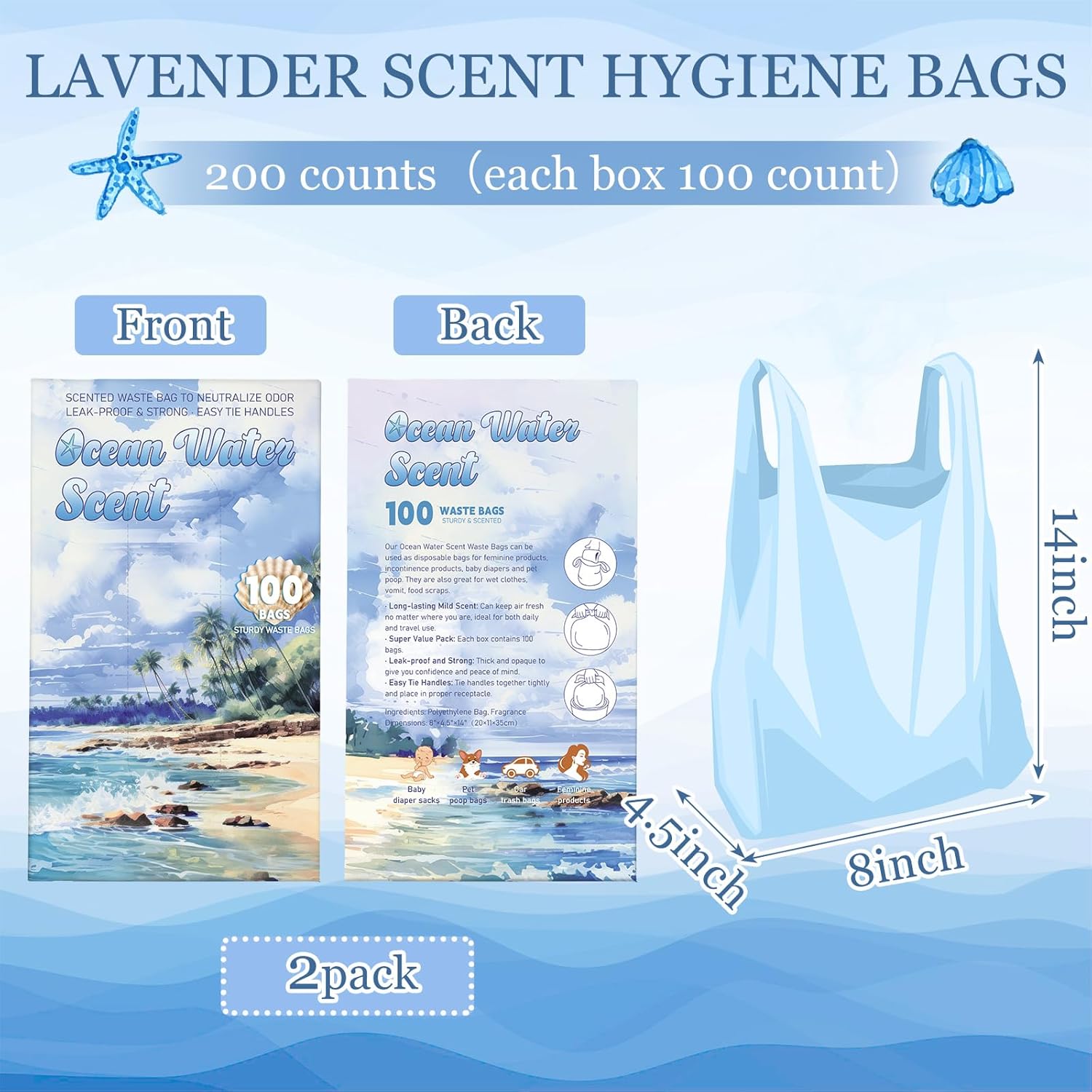 200 Count Ocean Water Scented Small Trash Bags Small Diaper Baggies for Adult Briefs Feminine Hygiene Baby Diaper Disposable Bags Pet Waste Sacks with Easy-to-tie Tabs