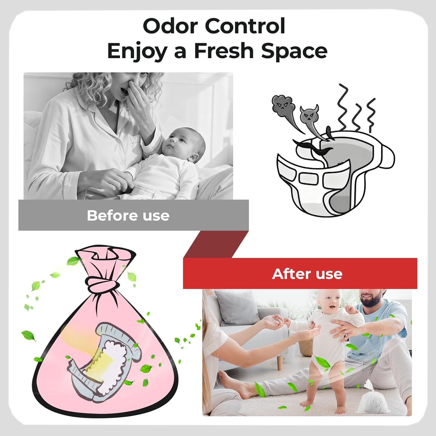 - Amazing Odor Control: Crafted with advanced odor-blocking technology, these baby diaper trash bags help conseal odor for baby used diaper up to 3–5 days. Unscented for baby and parents with sensitive noses