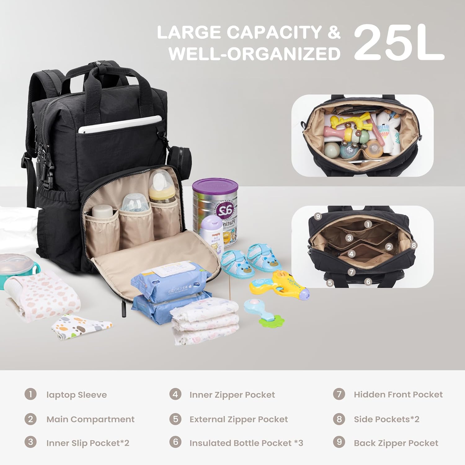 - 【25L Large Capacity Diaper Bag Backpack】 Spacious baby diaper bag(16.93*6.69*11.42") with 13 pockets including 15.6-inch laptop sleeve, iPad slot, wet isolation bag to store diapers, outfits, bottles, wipes, toys and parent tech. Never rummage again