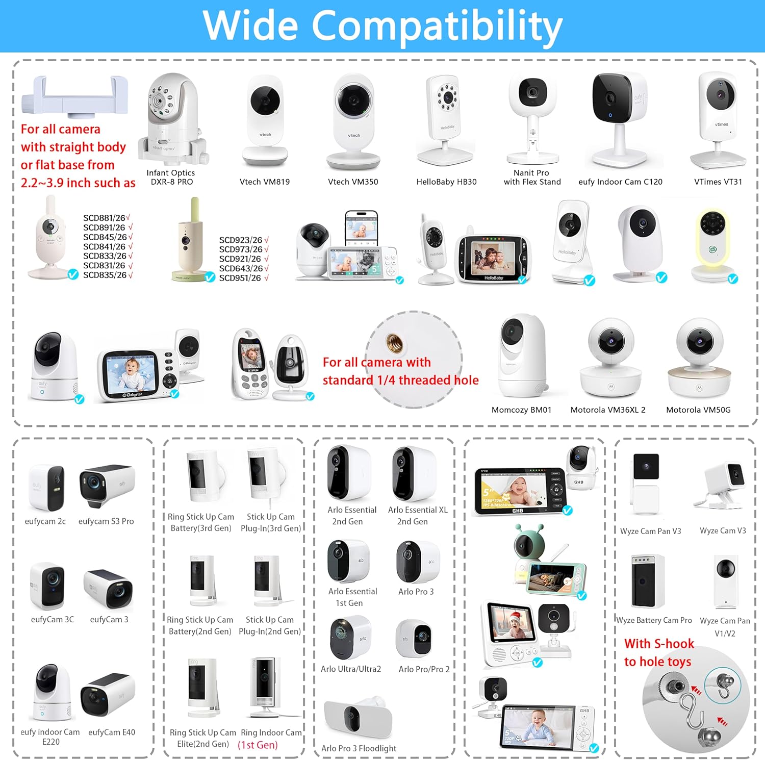 - VERSATILE COMPATIBILITY: Universal baby camera mount for most baby cameras with standard 1/4" screw hole or a straight camera body or base such as Motorola VM36XL/VM50G/Infant Optics DXR-8 Pro/Vtech VM819/Vtech VM350/Hellobaby/Momcozy/Nanit and more