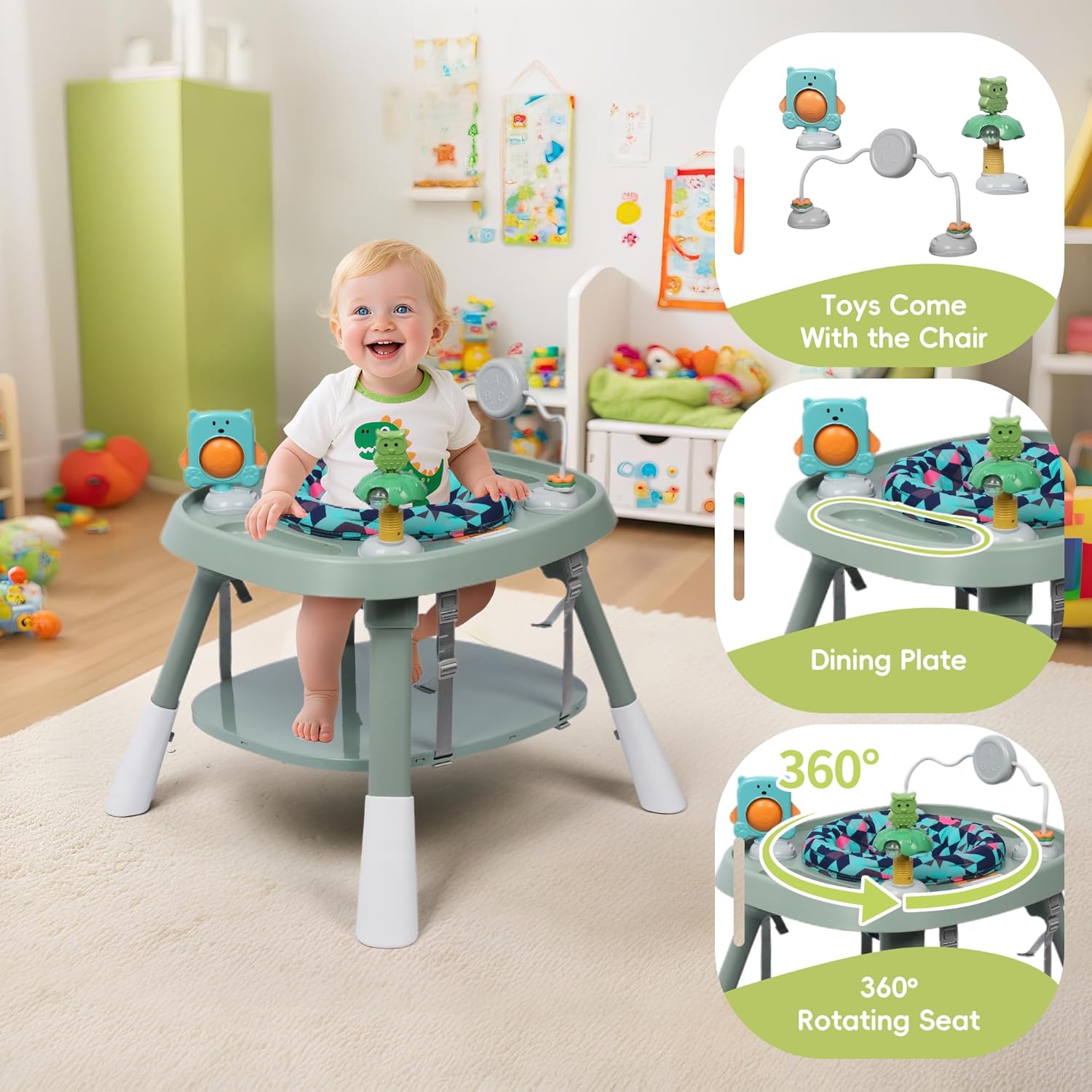 - Interactive Play Center: This high chair with activity center is designed to stimulate your baby's cognitive and motor skills. It features a 360-degree rotating seat and a range of interactive toys that will keep your child entertained while promoting their developmental growth. The flexible tray can be adjusted for different activities, ensuring that your baby can seamlessly transition from mealtime to playtime.