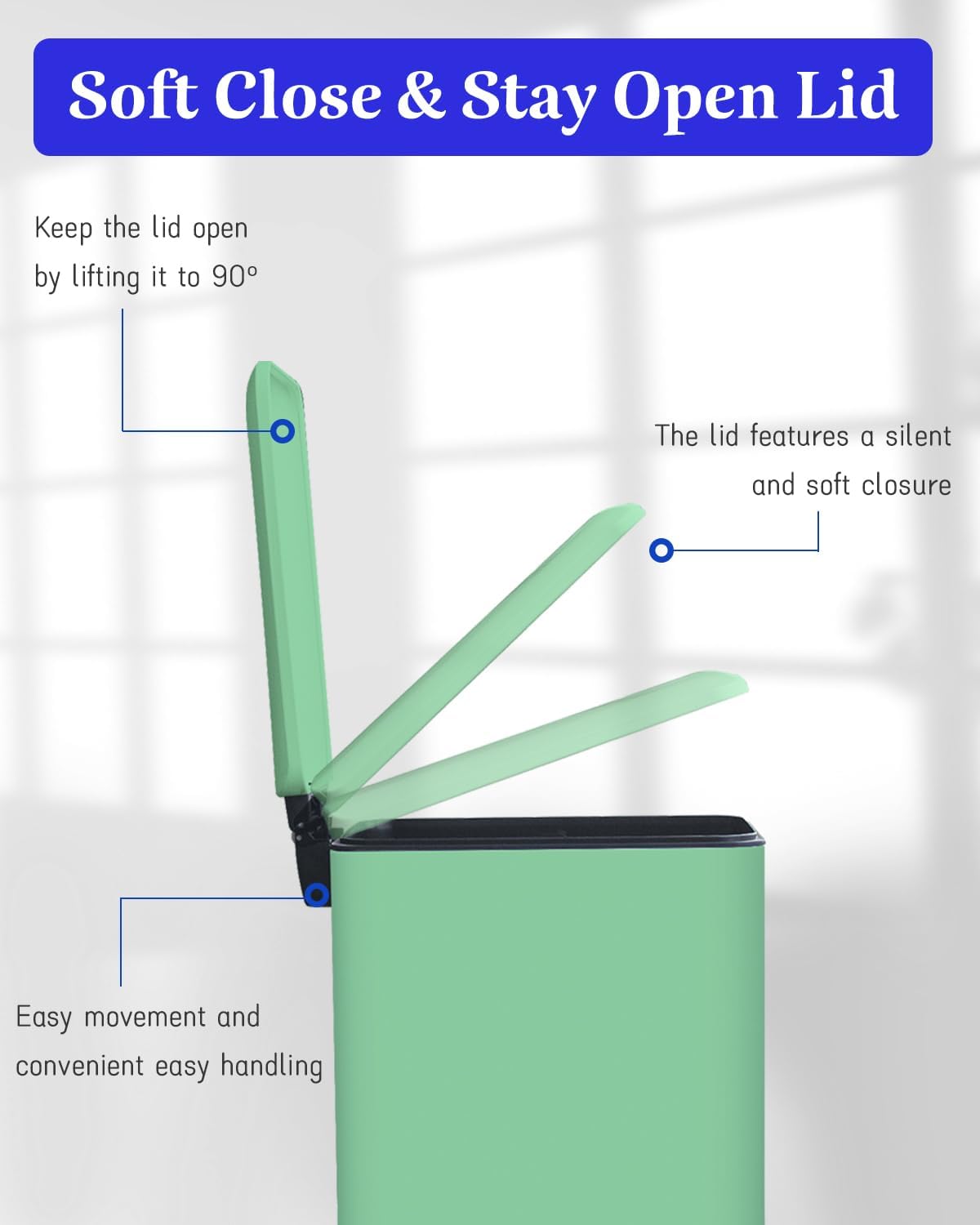 - Stay-Open & Soft-Close Lid Technology: Need hands-free convenience? The Green trash can kitchen with stay-open lid holds securely while loading trash, then closes quietly with soft-close precision. Perfect for messy cooking sessions in your kitchen trash can setup!