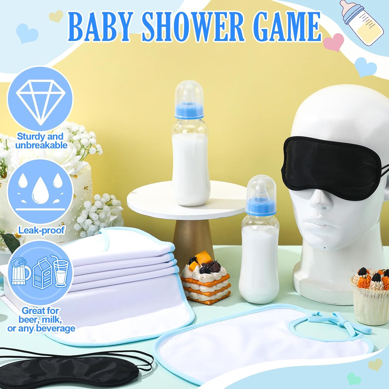 - Durable Materials: the baby shower game bottles are made of plastic, so you don't have to worry about the game breaking and affecting the gaming experience, the blindfold eye masks and bibs are also made of sturdy materials and will not tear easily leading to a bad gaming experience