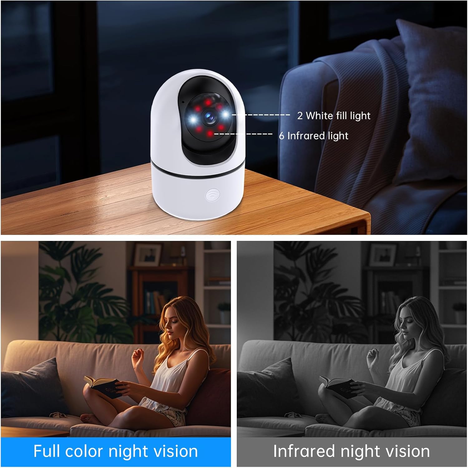 - 【2K Full-Color Night Vision】Say goodbye to blurry black-and-white images.Even in pitch-black environments, indoor security camera delivers high-definition color footage with clear details, leaving no blind spots in nighttime security. Wireless camera indoor is equipped with a built-in microphone and speaker, enabling clear two-way talk, allowing you to chat with your family clearly anytime.