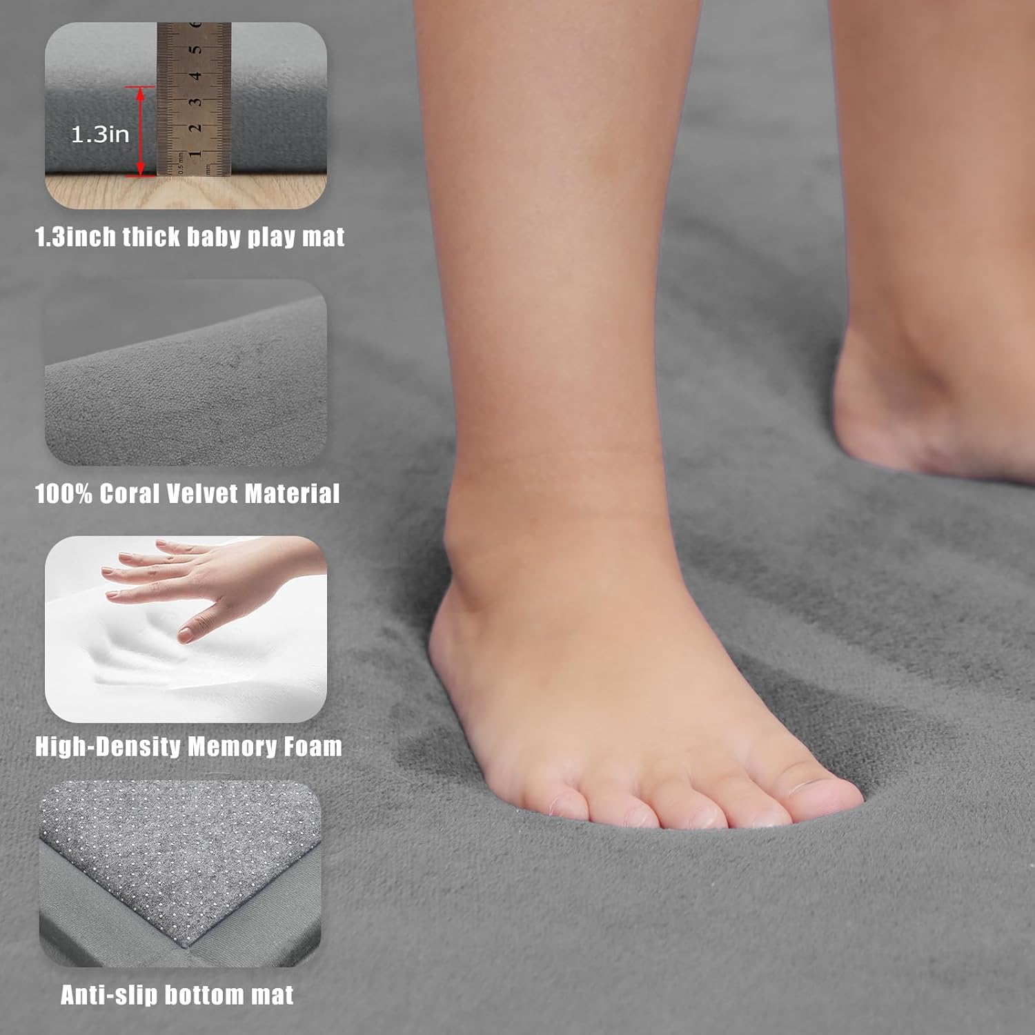 - Soft & Safe Baby Play Mat: Crafted with ultra-soft coral velvet and a plush 1.3" thick memory foam filling, this baby play mat for floor ensures a gentle touch for your baby's delicate skin. our memory foam rug offers a nurturing environment for tummy time, crawling, and play, allowing babies to explore safely on this comfortable surface