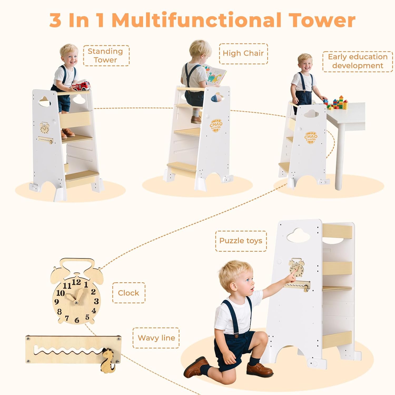 - 3-in-1 Design: Helper Tower, Highchair & Activity Center More than just a kitchen helper! This versatile tower easily converts into a secure highchair for mealtime and a sensory play station. It includes engaging like a clock puzzle and a fine motor labyrinth to nurture curiosity and independent learning.