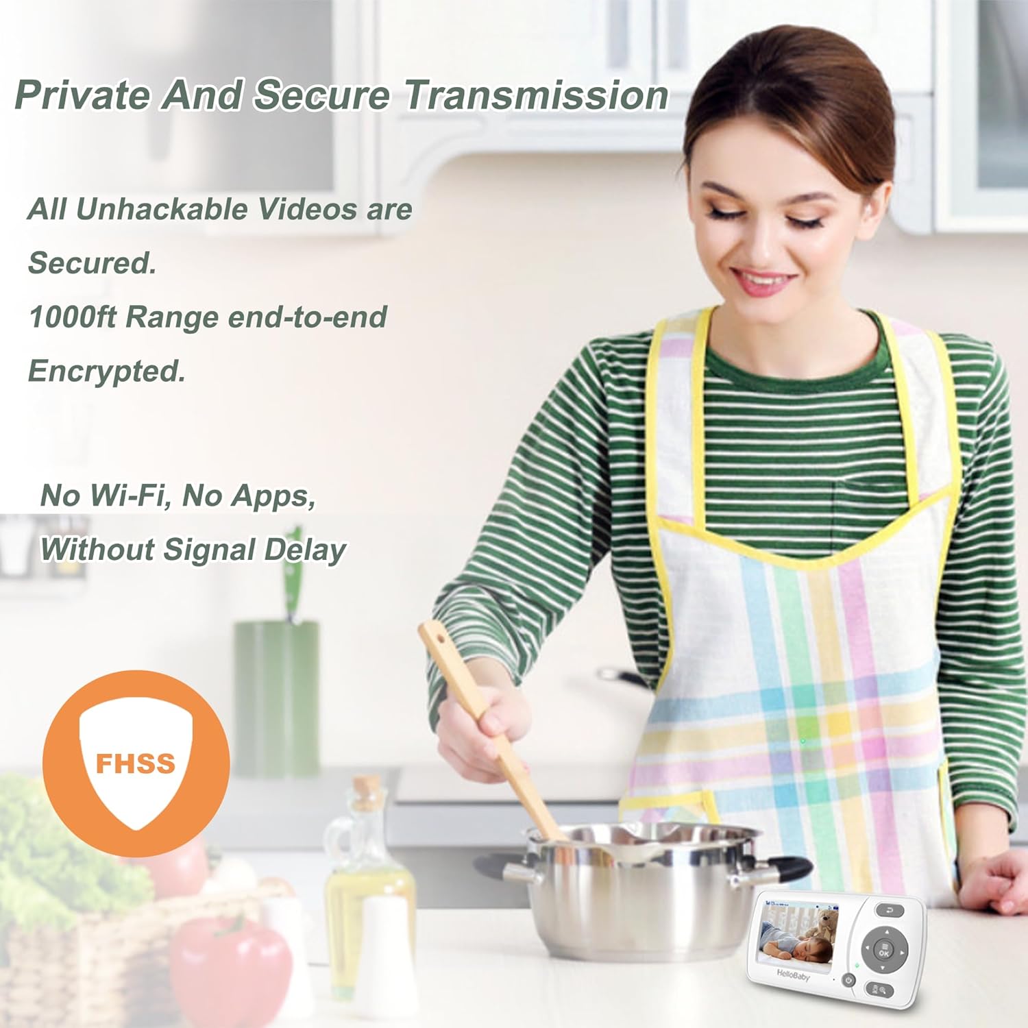 - Easy To Set Up and No Wi-Fi No APP:Hellobaby Video Baby Monitor is a Plug-and-Play Wireless Baby Monitor, Which Adopts The Exclusive Patented 2.4Ghz Wireless Technology Fhss(Frequency-Hopping Encryption Technology) Transmission. It is Less Radiation, anti-Interference Stronger, And More Stable Transmission than Wifi. No Matter Which Room You are in, You Are the Only One Who Can Hear and See Your Baby.