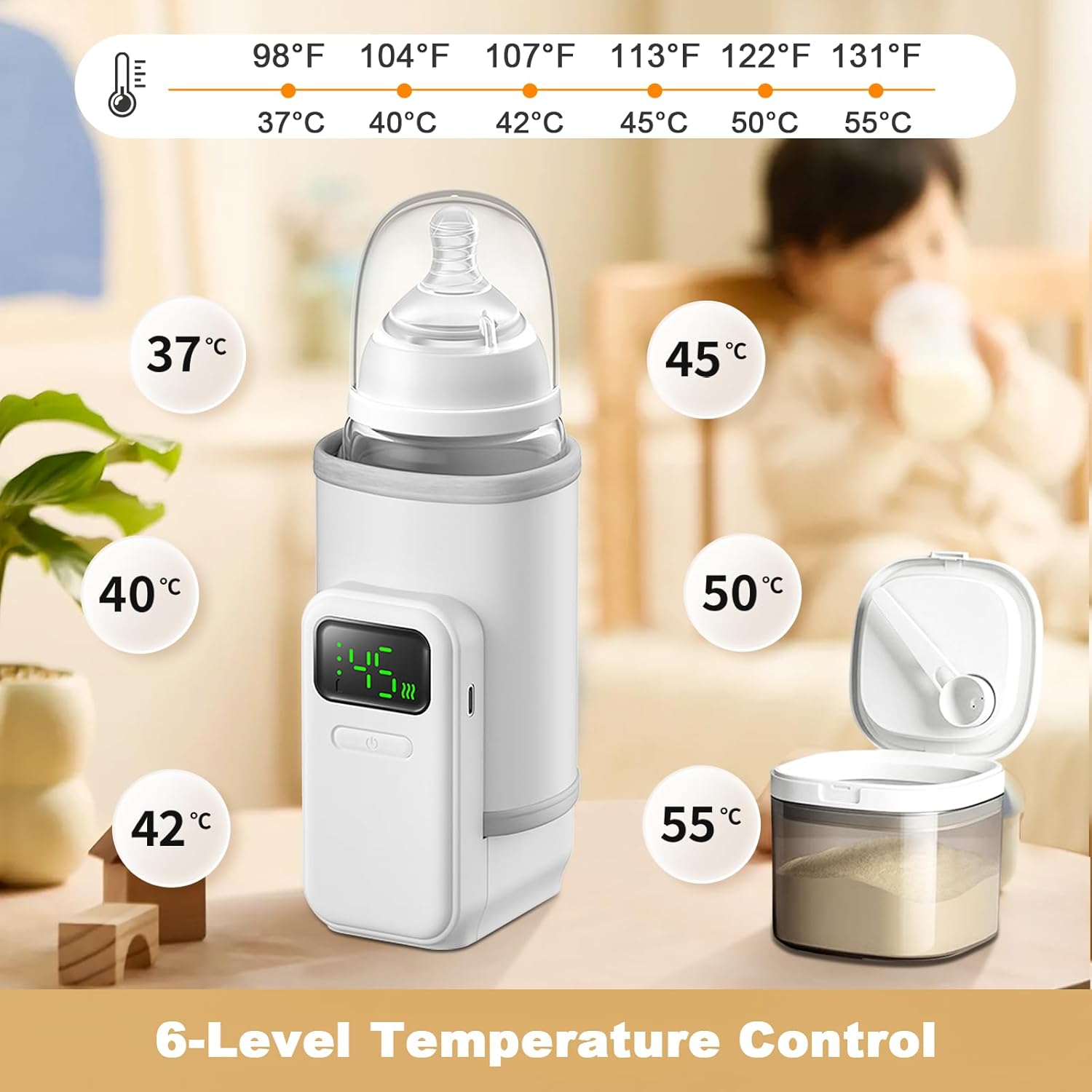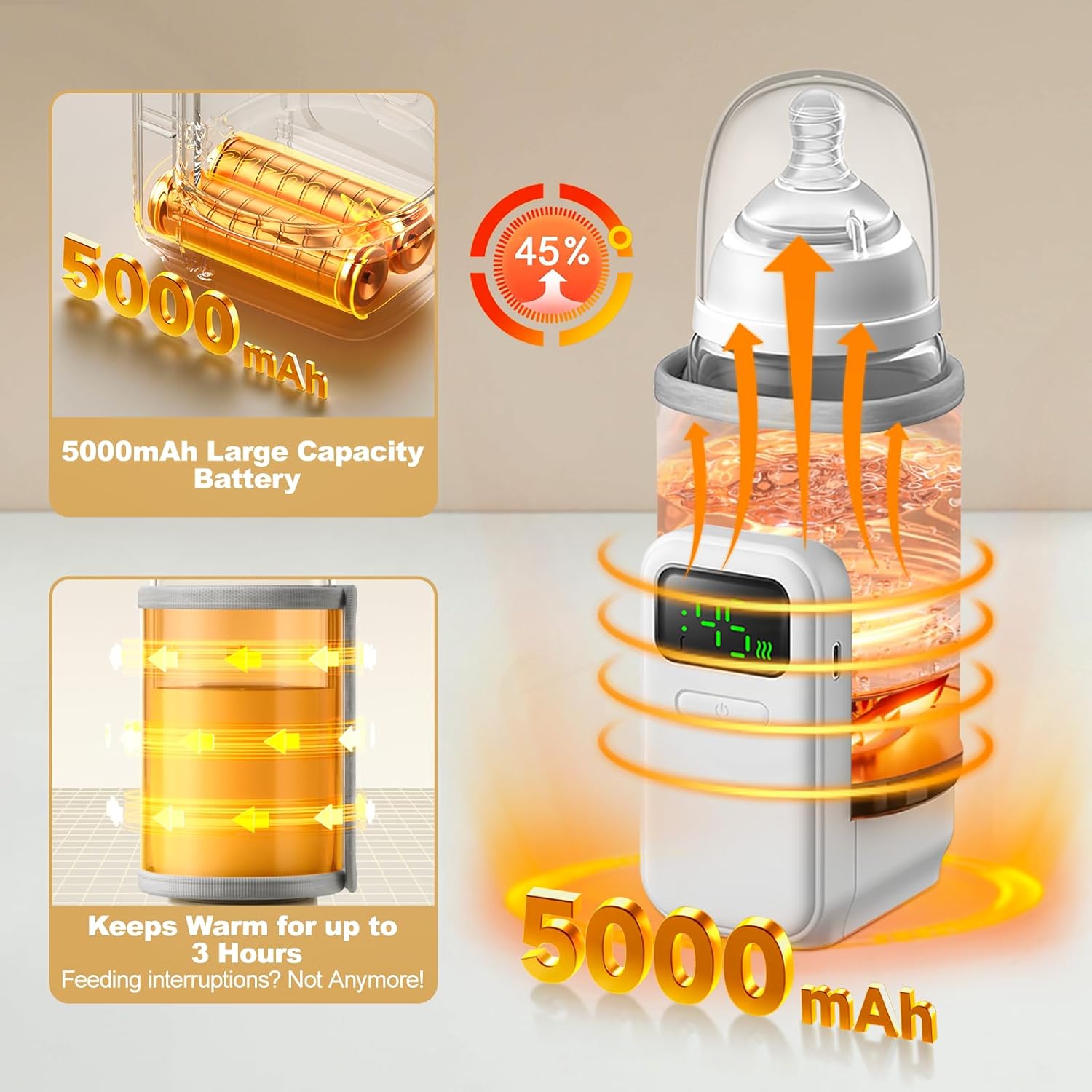 - [Fast & Efficient Heating] The portable bottle warmer has a built-in 5000mAh battery, supporting continuous heating.It heats milk to ideal temperature in 15-30 minutes (varies by volume and initial temp).The 360-degree wrap-around heating ensures even warmth throughout the bottle.