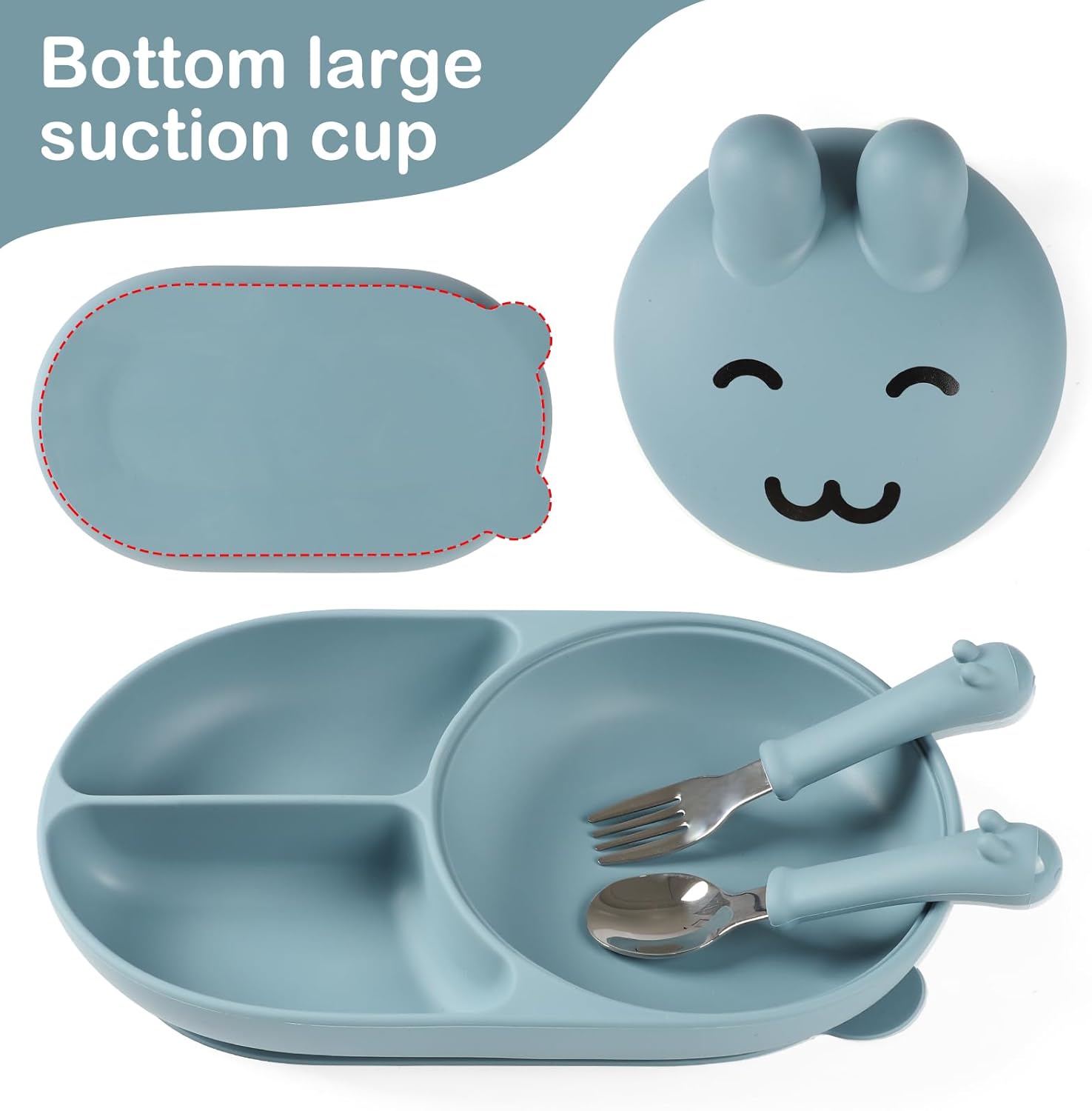 Silicone Baby Plate,Toddler plates,Self-feeding of infants after weaning, 100% Food Grade Silicone, BPA Free, Including Fork and Spoon, Baby Plates With Suction, Divided Plate for Babies(blue)
