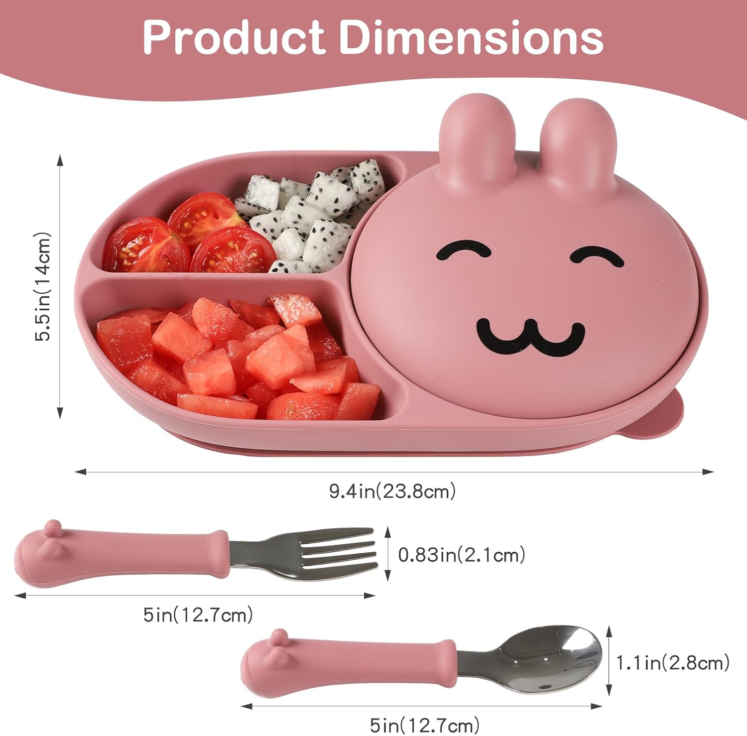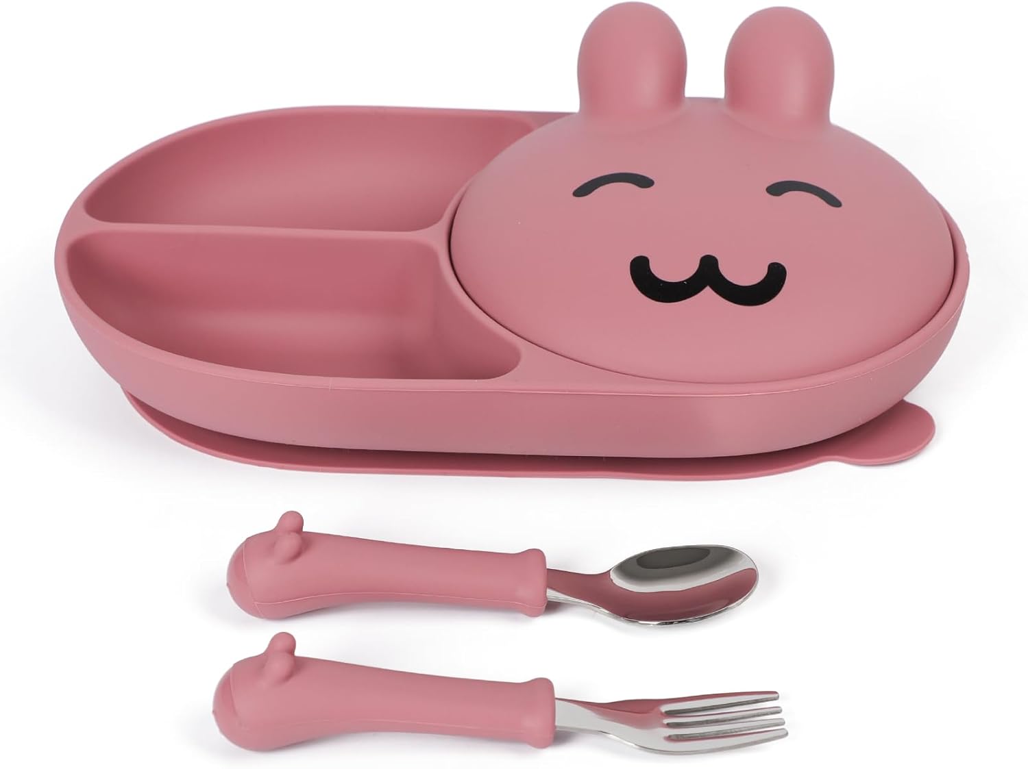 - 【Novelty design】Plate using the rabbit-shaped design concept, three-format separation layout, with a rabbit head cover makes the overall shape is very cute, the bottom of a large area of the suction cup molded in one piece, can be well adsorbed in the high chair or flat table, toddlers feeding themselves will not move at will, equipped with a pair of forks and spoons, this set of dinner plate is a good helper for the baby to eat independently