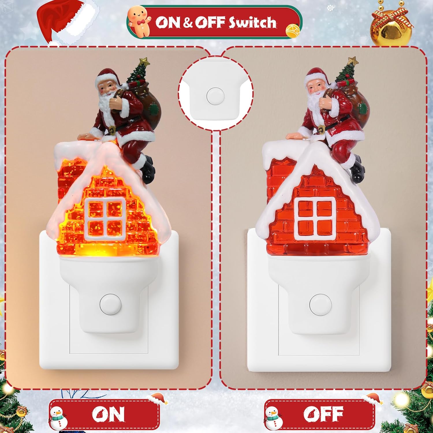 - Compact & Festive Design: Celebrate the holidays with this charming Christmas night light, designed to blend festive cheer with practical functionality! Its ultra-compact base fits snugly into any outlet without blocking the second socket, ensuring you can keep other devices plugged in while enjoying its warm glow. This night light doubles as both a practical night light and a decorative accent piece.