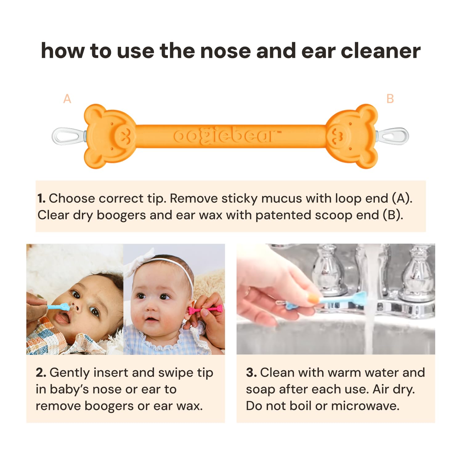 - Safe & gentle: Soft yet structured rubber tips are engineered to be comfortable (and still effective). Textured rubber makes the handle easy-to-grip for parents. The adorable bear-head safety bumper prevents the tool from going too far into tiny noses and ears.