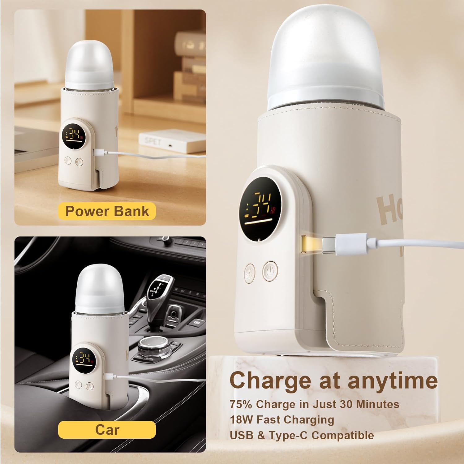 18W Portable Baby Bottle Warmer for Travel – Fast, Waterless Milk Heater for Breastmilk & Formula | USB Rechargeable Bottle Warmer with Precise Temperature Control – Essential for On-The-Go Feeding