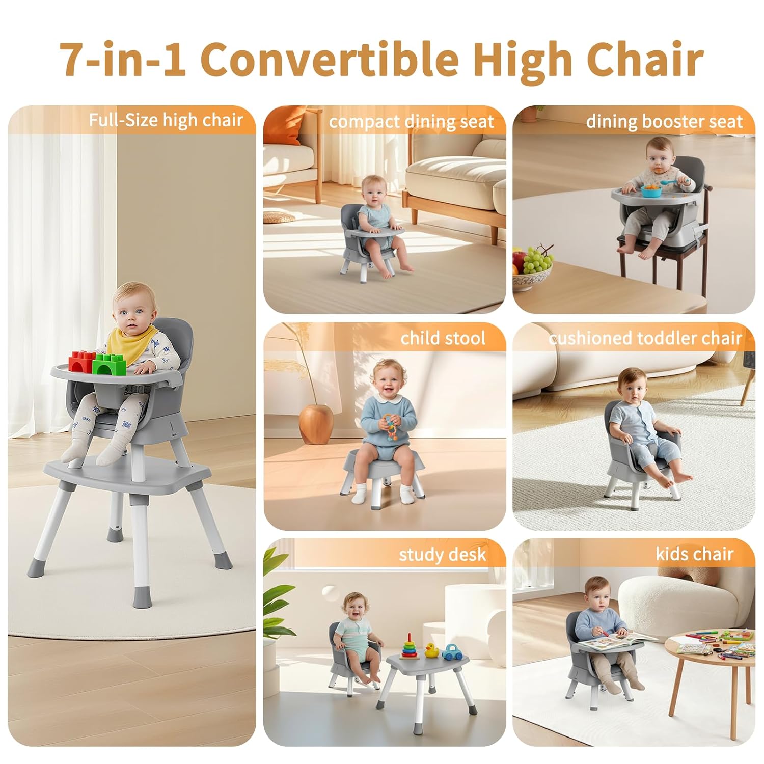 - 7-in-1 Convertible High Chair: This versatile high chair transforms into 7 functional modes: Full high chair, dining booster, compact dining seat, cushioned toddler chair, kids chair, study desk, and child stool. Grows with your child from infancy to preschool years