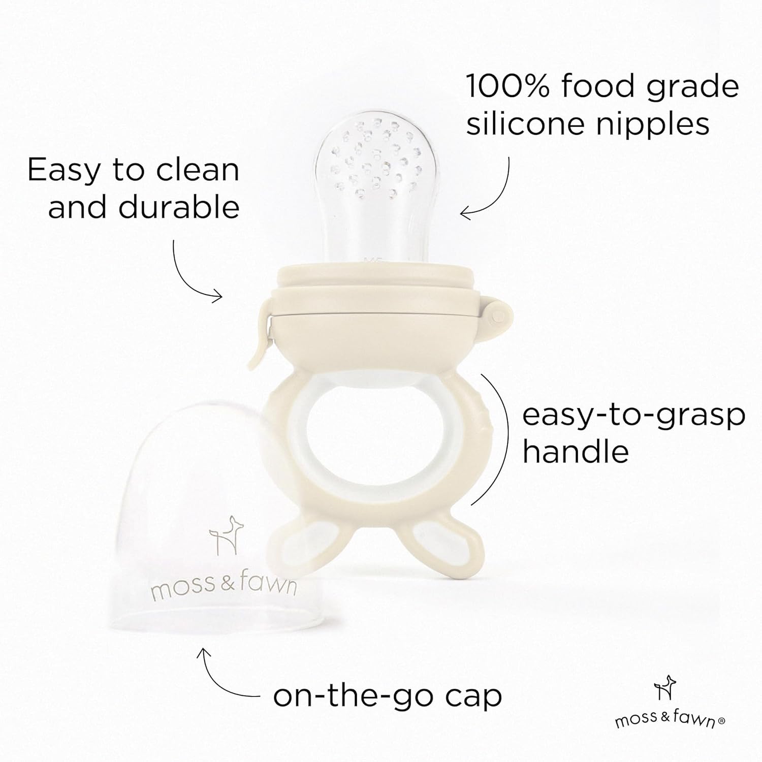- Perfect Baby Food Bundle | Moss & Fawn’s Forage Feeder, Ice Cube Tray, and Gather & Roll Bib are all helpful at introducing babies to solid foods and soothing teething.