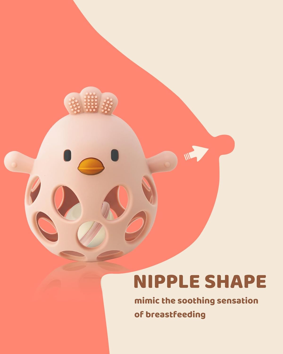 - 【2-in-1 Teething & Rattle Toy】This innovative teething toy set includes an easy-to-grasp teether and a rattle ball. The chick-shaped teether features extra grip holes, making it easier for babies to hold. The built-in rattle encourages babies to grasp, shake, and play, helping to develop hand-eye coordination and enhance sensory awareness.