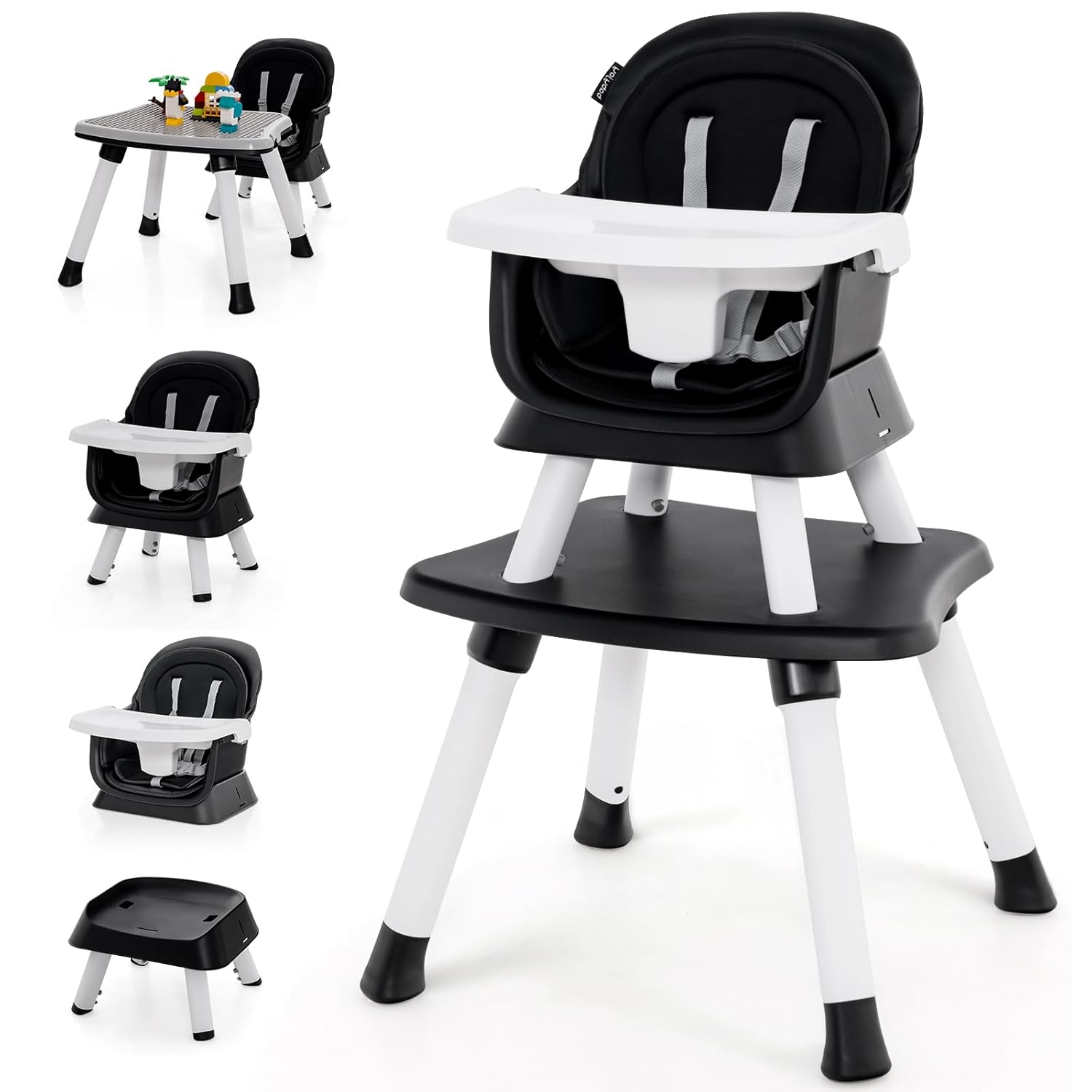 - 8-IN-1 CONVERTIBLE: This baby high chair transforms into a full-size high chair, booster seat, floor chair, toddler chair, stool, kids table and chair, and a building block activity table. Smooth/grooved tabletop supports meals or play, fitting family dining, playrooms and small apartments.