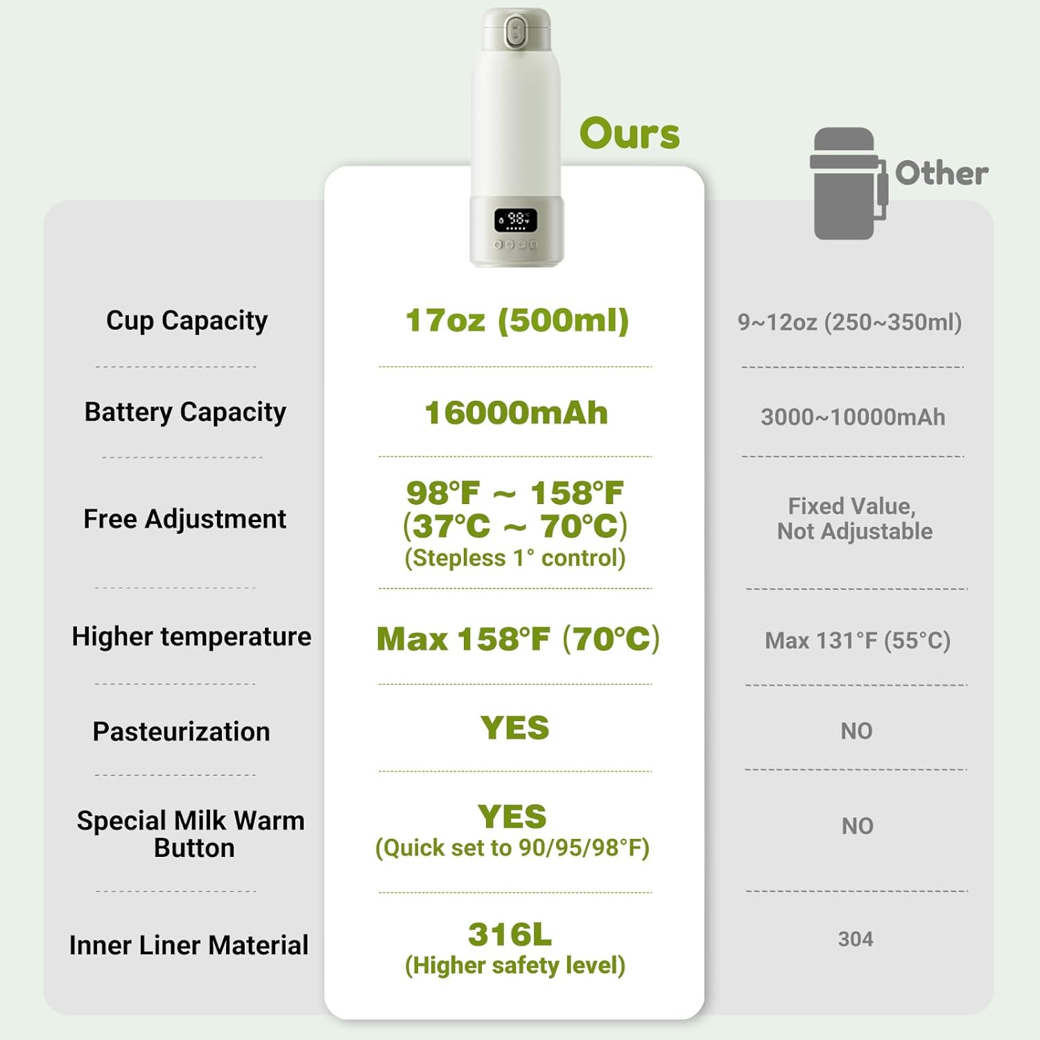 - 🌡️ * Advanced Heating Technology * - Reaches 70°C (158°F) maximum temperature, significantly higher than typical portable warmers. Perfect for manual pasteurization function that competitors don't offer.